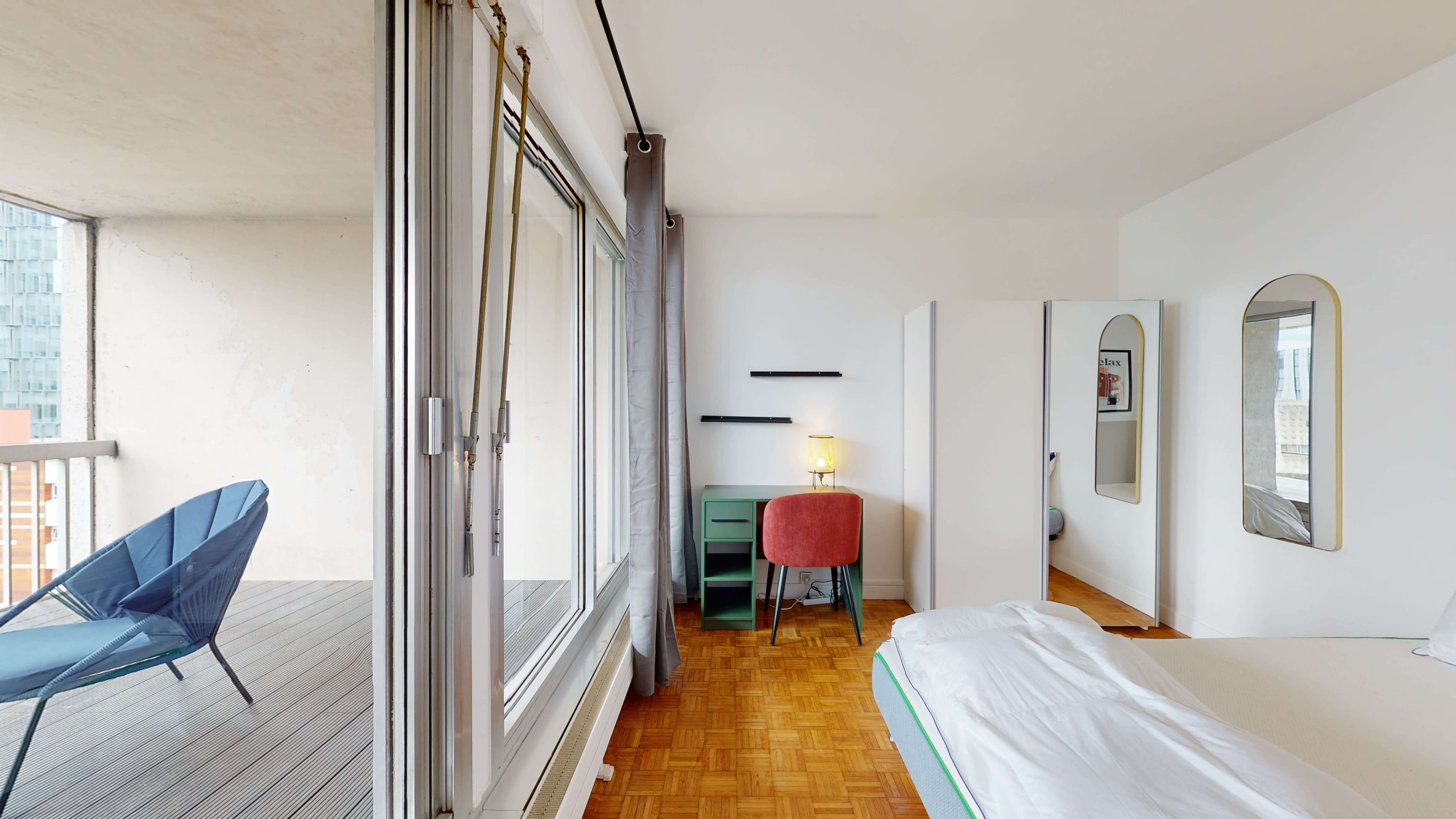 La chambre Room 4 est idéale pour une personne. Elle dispose d'un lit double confortable, d'une armoire pour ranger vos affaires, d'une chaise et d'un bureau pour travailler ou étudier. La fenêtre s'ouvre sur un balcon privé où vous pouvez prendre l'air. La salle de bain est partagée avec d'autres locataires et est équipée d'une douche moderne, d'un lavabo et de toilettes.
