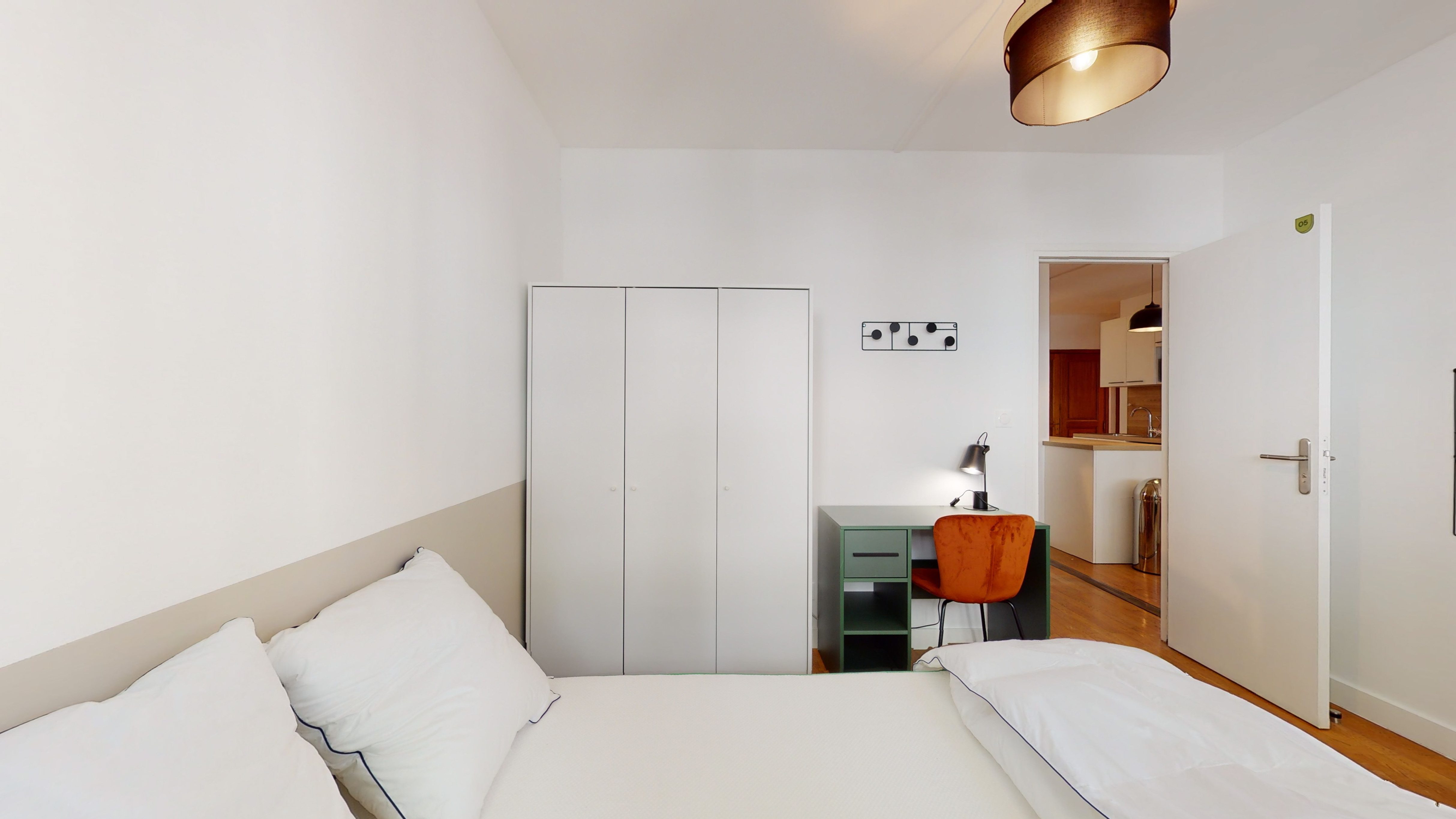 La chambre disponible, Room 5, est un petit cocon juste pour vous. Avec un lit double confortable, une armoire pour vos vêtements, un bureau et une chaise pour travailler ou étudier, cette pièce est conçue pour une personne. Vous aurez également un accès partagé à une salle de bain propre et moderne.