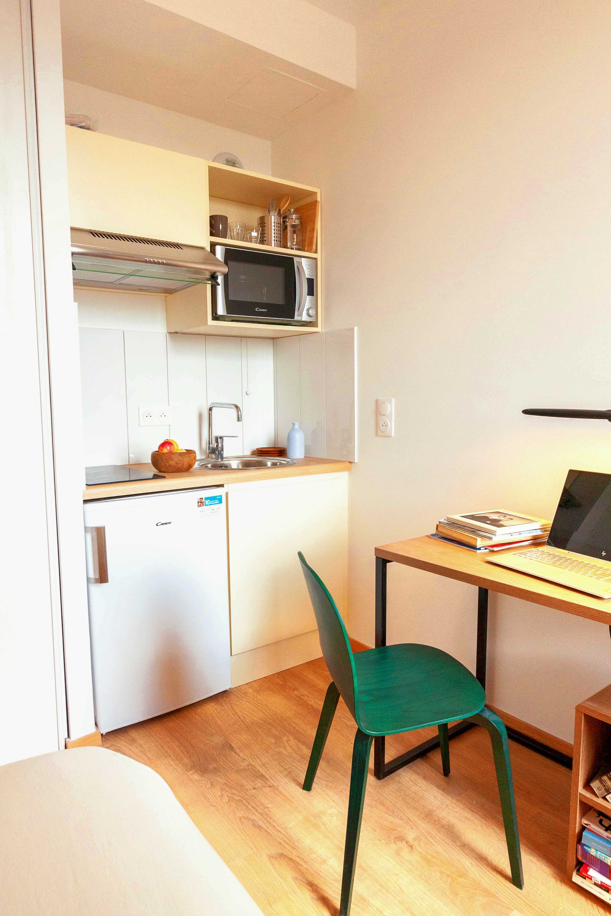 Le Studio 303 est un espace privé et bien aménagé de 20m2, situé au troisième étage. Parfait pour une personne, il dispose d'une kitchenette équipée pour préparer vos repas en toute intimité, d'une salle de bain moderne avec douche, et d'un mobilier complet : un lit confortable avec literie de qualité, un bureau avec lampe pour travailler ou étudier, une penderie spacieuse pour vos vêtements, et même un fauteuil pour se relaxer après une longue journée.