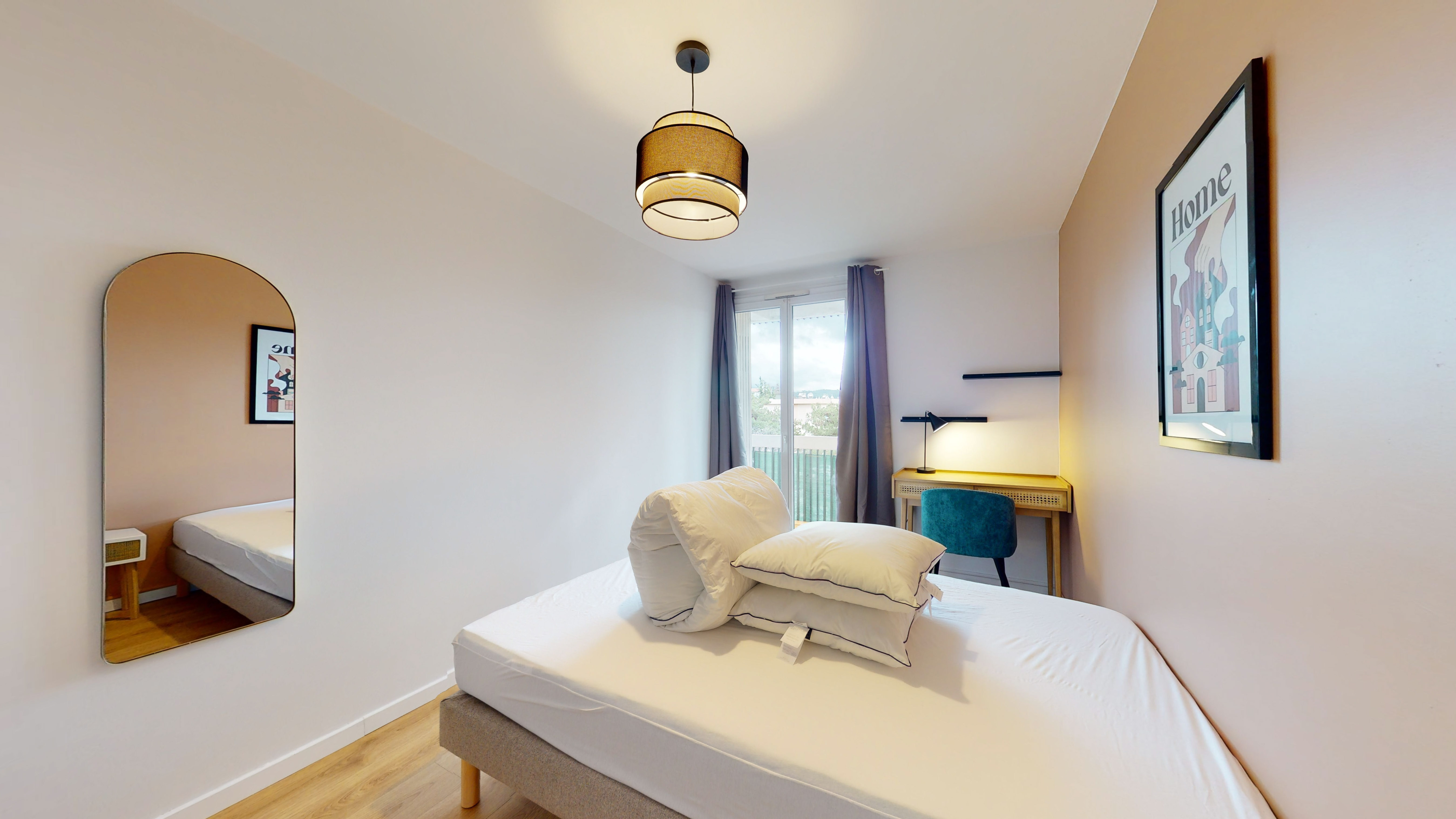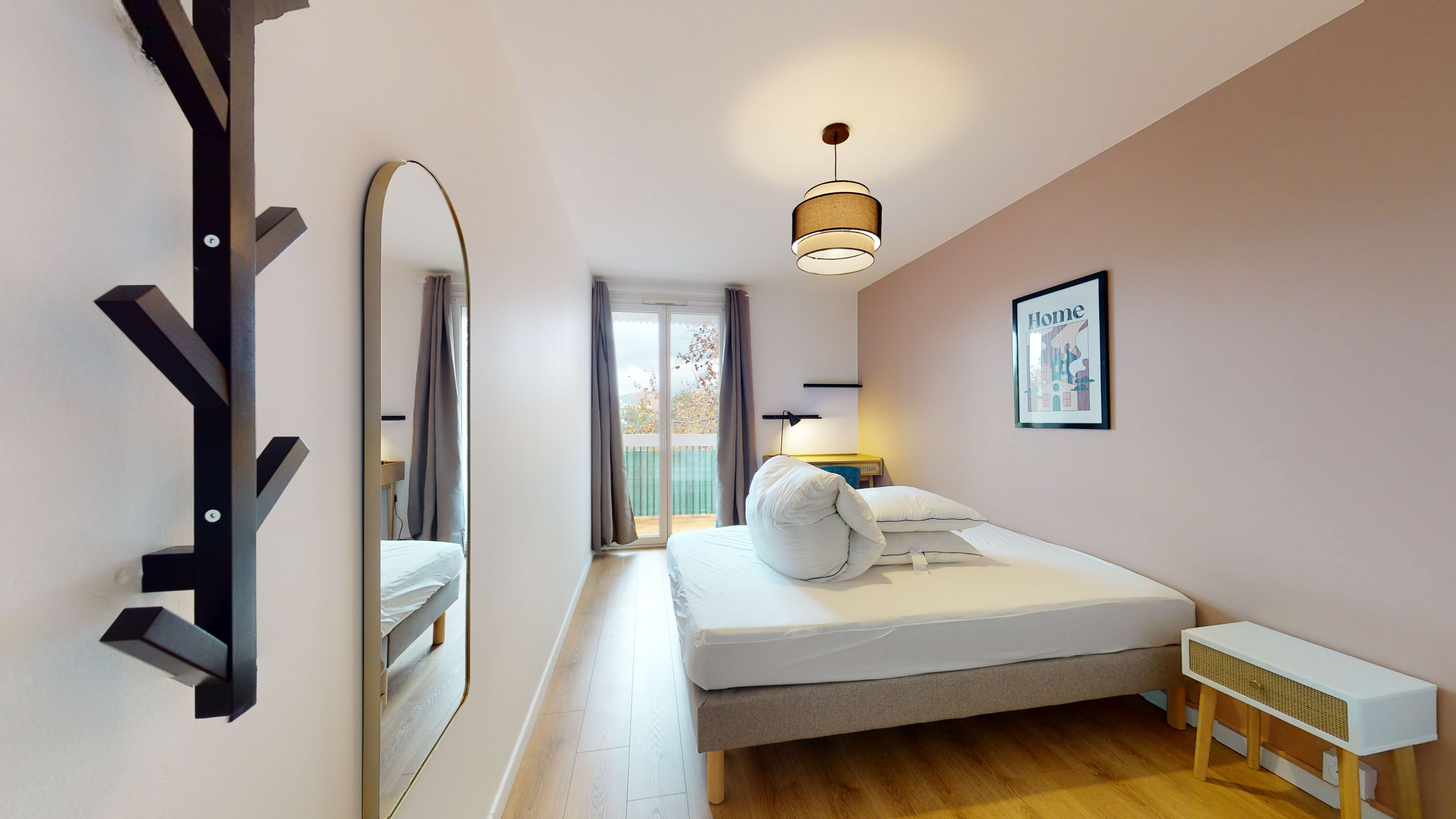 La chambre 3, conçue pour un occupant, est un espace privé de 11 m². Elle est meublée avec un lit double confortable, une armoire pour vos affaires, une chaise et un bureau pour travailler ou étudier. La chambre bénéficie d'une salle de bain partagée avec douche et toilettes, et vous aurez aussi votre propre accès au balcon. C'est l'endroit parfait pour avoir votre petit coin tranquille tout en partageant la vie en communauté.
