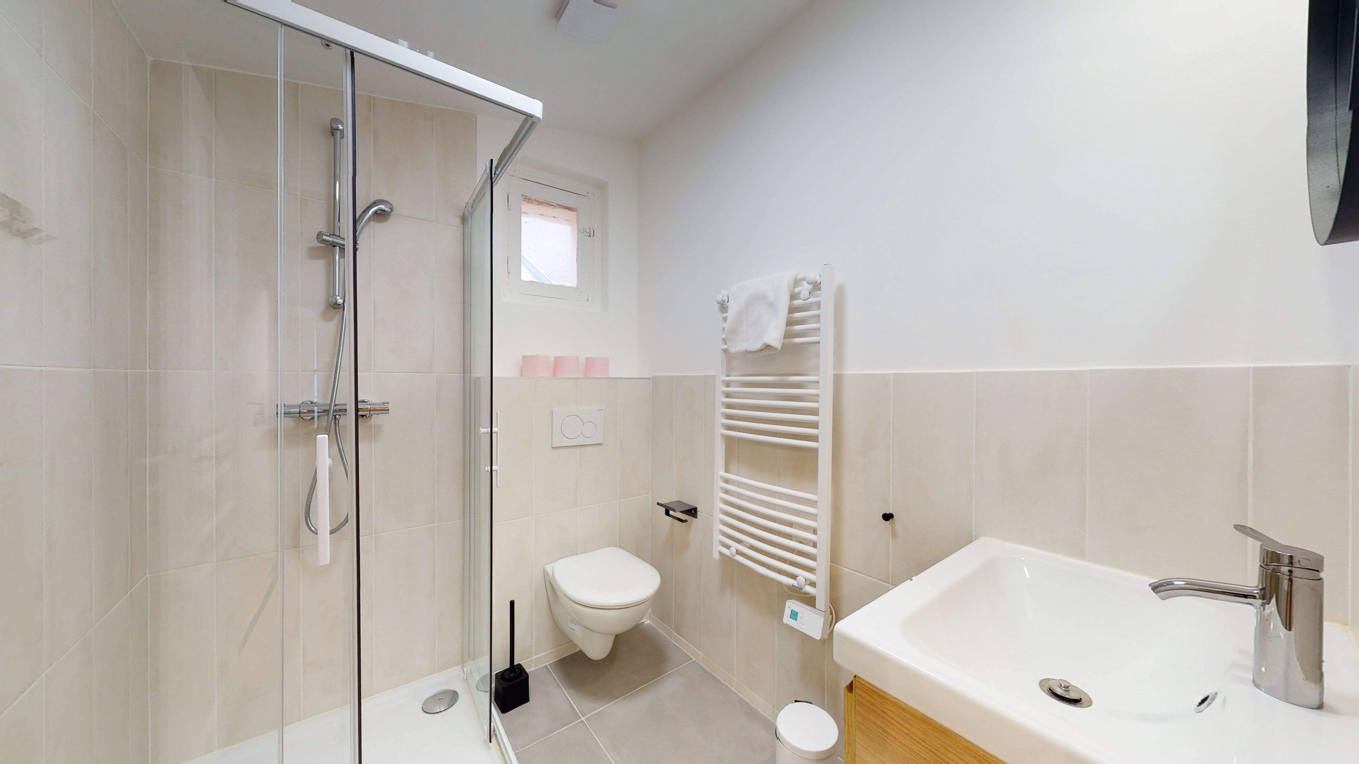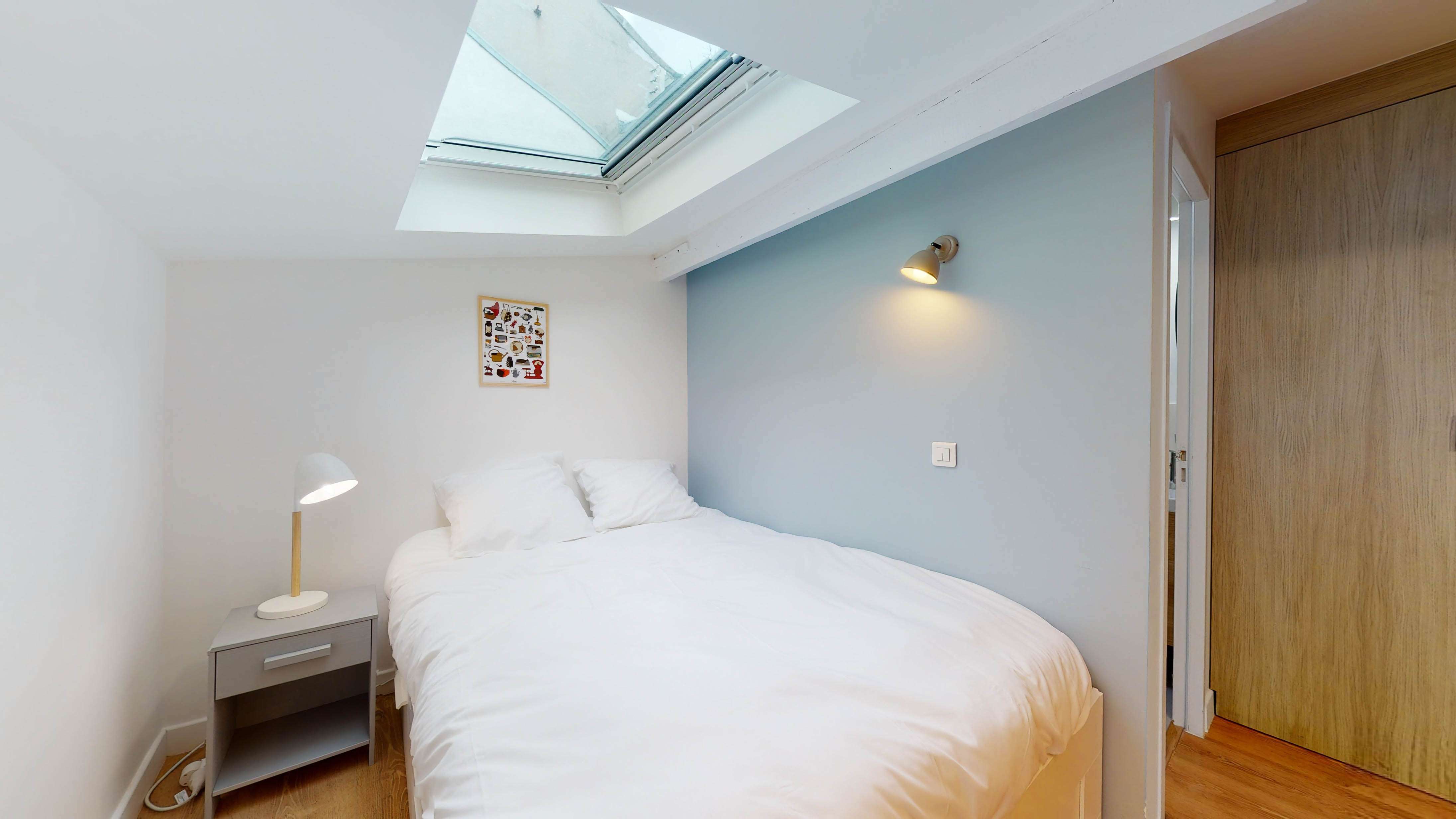 La chambre "Room for one person - 6" est un cocon douillet de 17m² situé au premier étage. Elle est parfaite pour une personne avec son lit double confortable, sa grande armoire pour ranger toutes vos affaires, une chaise et un bureau pour travailler ou étudier. La salle de bain privée est équipée d'une douche moderne. Vous bénéficierez également d'un radiateur pour rester au chaud, d'une lampe de chevet pour vos lectures nocturnes et d'une literie de qualité pour un sommeil réparateur.