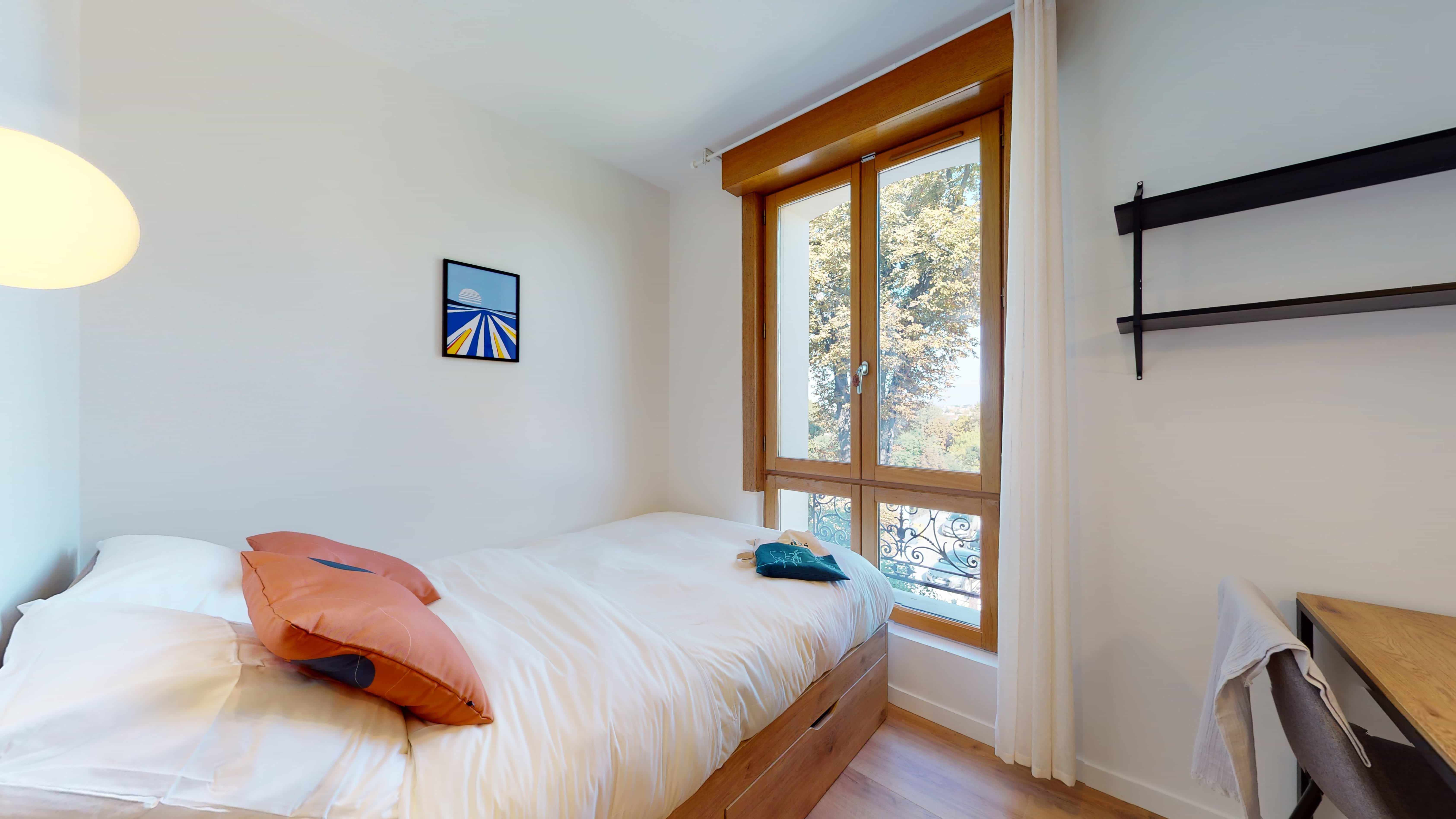 Votre future chambre, la "Room for one person - 8", située au 1er étage, est un cocon de 13m2 juste pour vous. Elle dispose d'un lit confortable avec rangement intégré, d'un bureau pour travailler, d'une chaise, d'une penderie pour vos vêtements et d'une salle de bain privée avec douche. La pièce est bien chauffée et éclairée, parfaite pour votre intimité et votre confort.