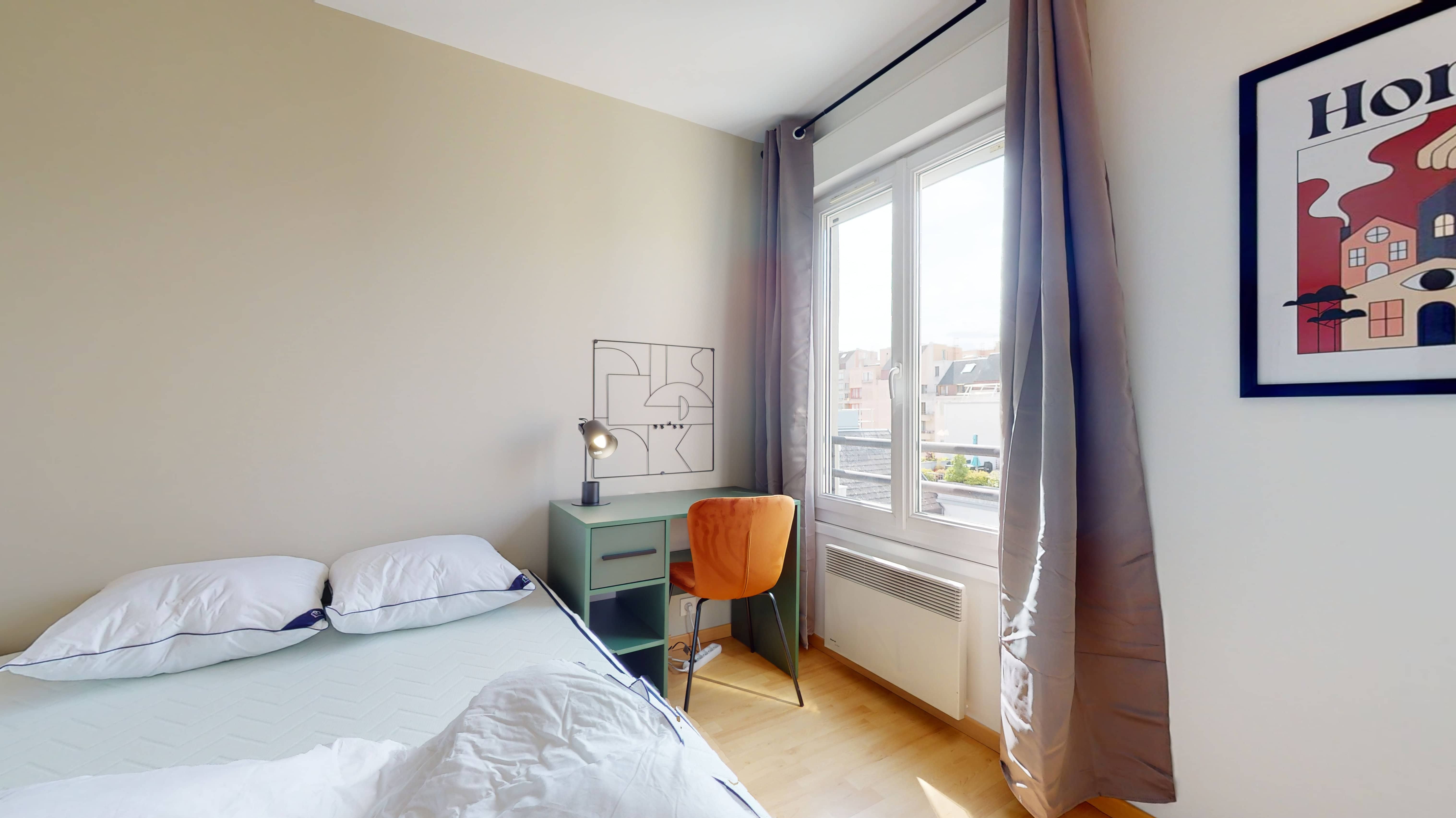 La chambre Room 4, prévue pour une personne, est un petit havre de paix avec un lit double confortable, une armoire pour vos vêtements et un espace de travail composé d'un bureau et d'une chaise. La fenêtre est habillée de rideaux pour votre intimité et la chambre partage une salle de bain moderne avec les autres résidents.