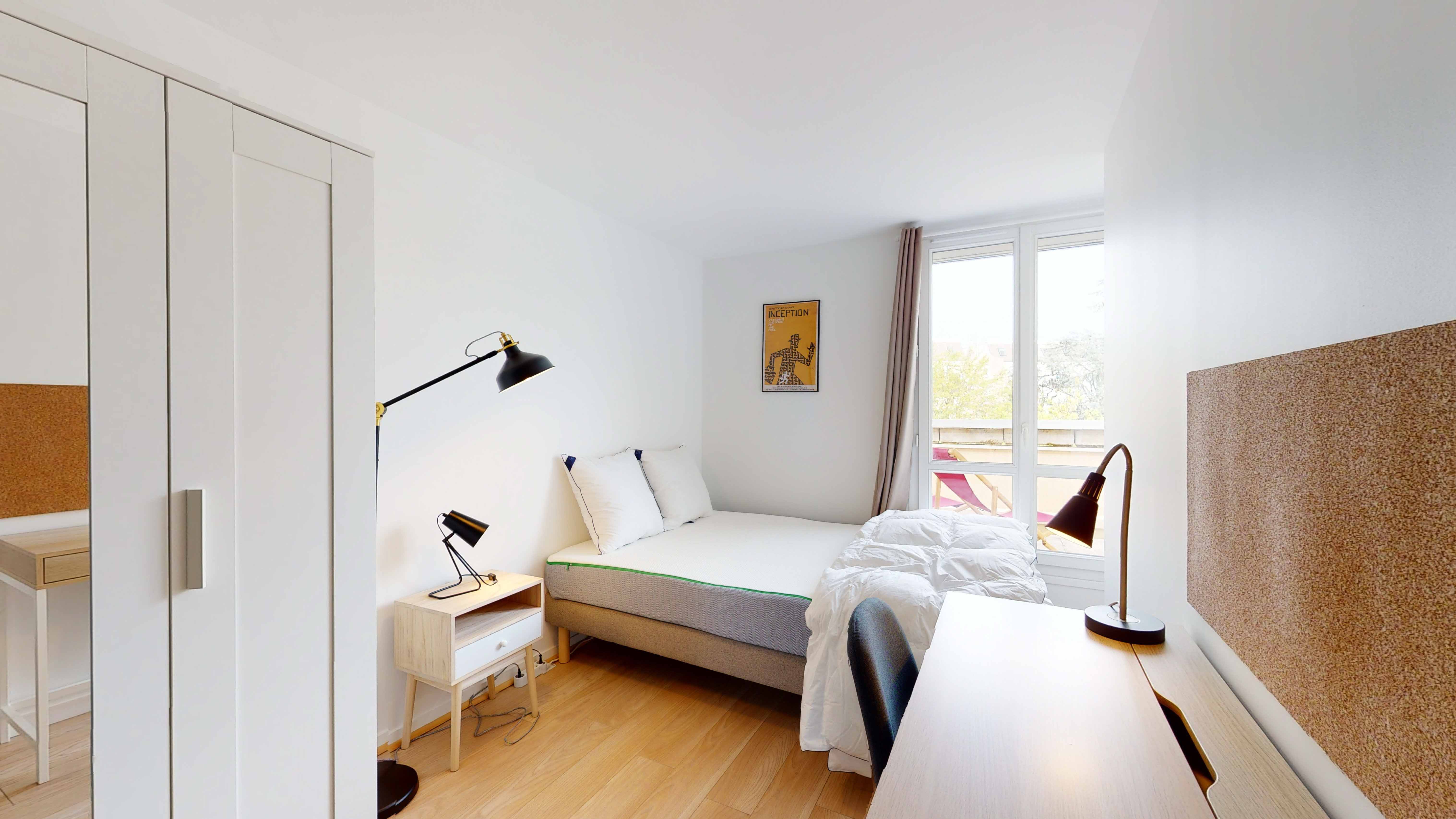 La chambre Room 4 est juste ce qu'il faut pour une personne. Elle a un lit double confortable, une armoire pour vos vêtements, un bureau et une chaise pour étudier ou travailler. Vous aurez aussi une salle de bain partagée avec douche et toilettes. C'est un petit espace bien à vous de 11 m² où vous pouvez vous reposer et être tranquille.
