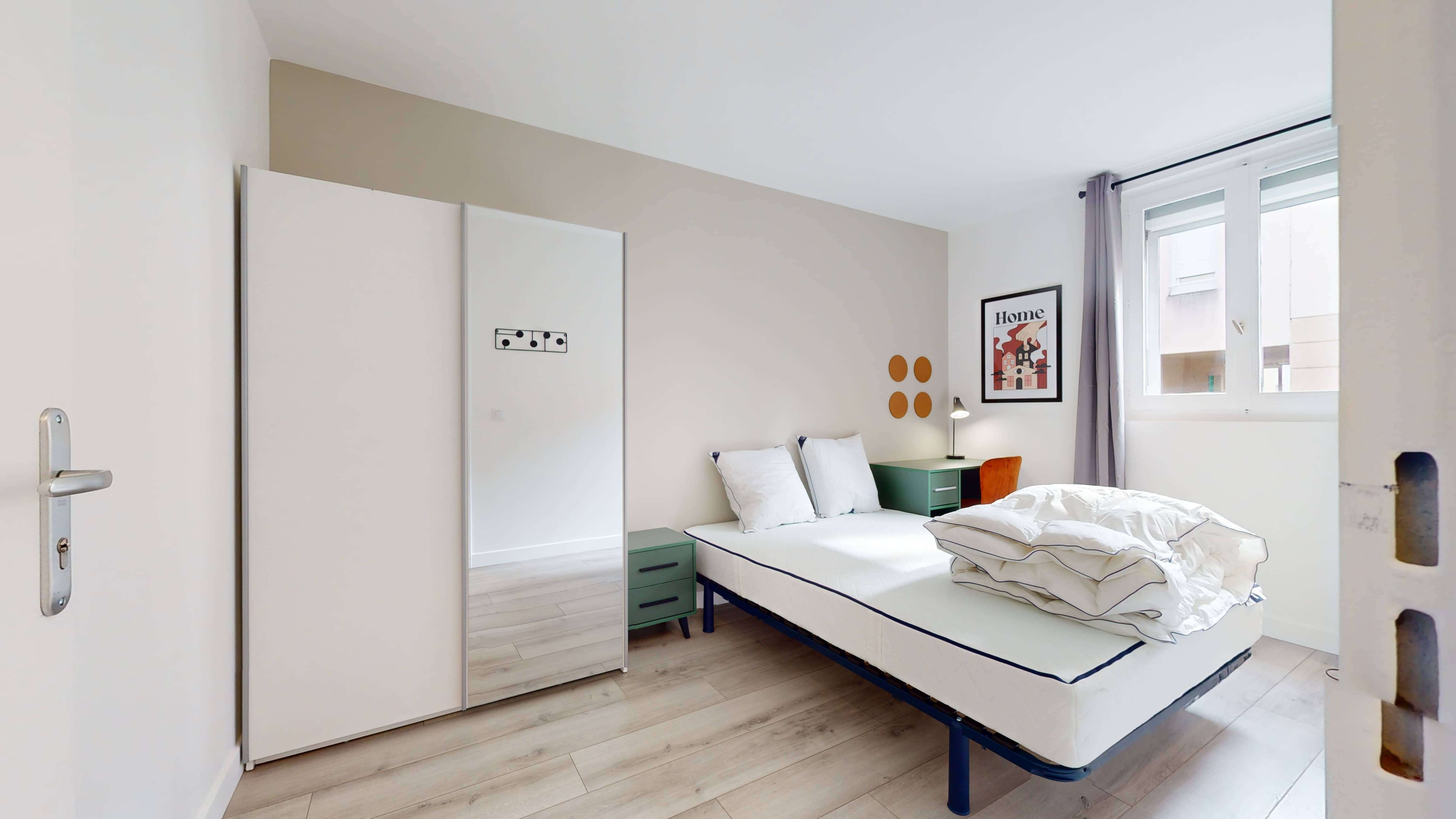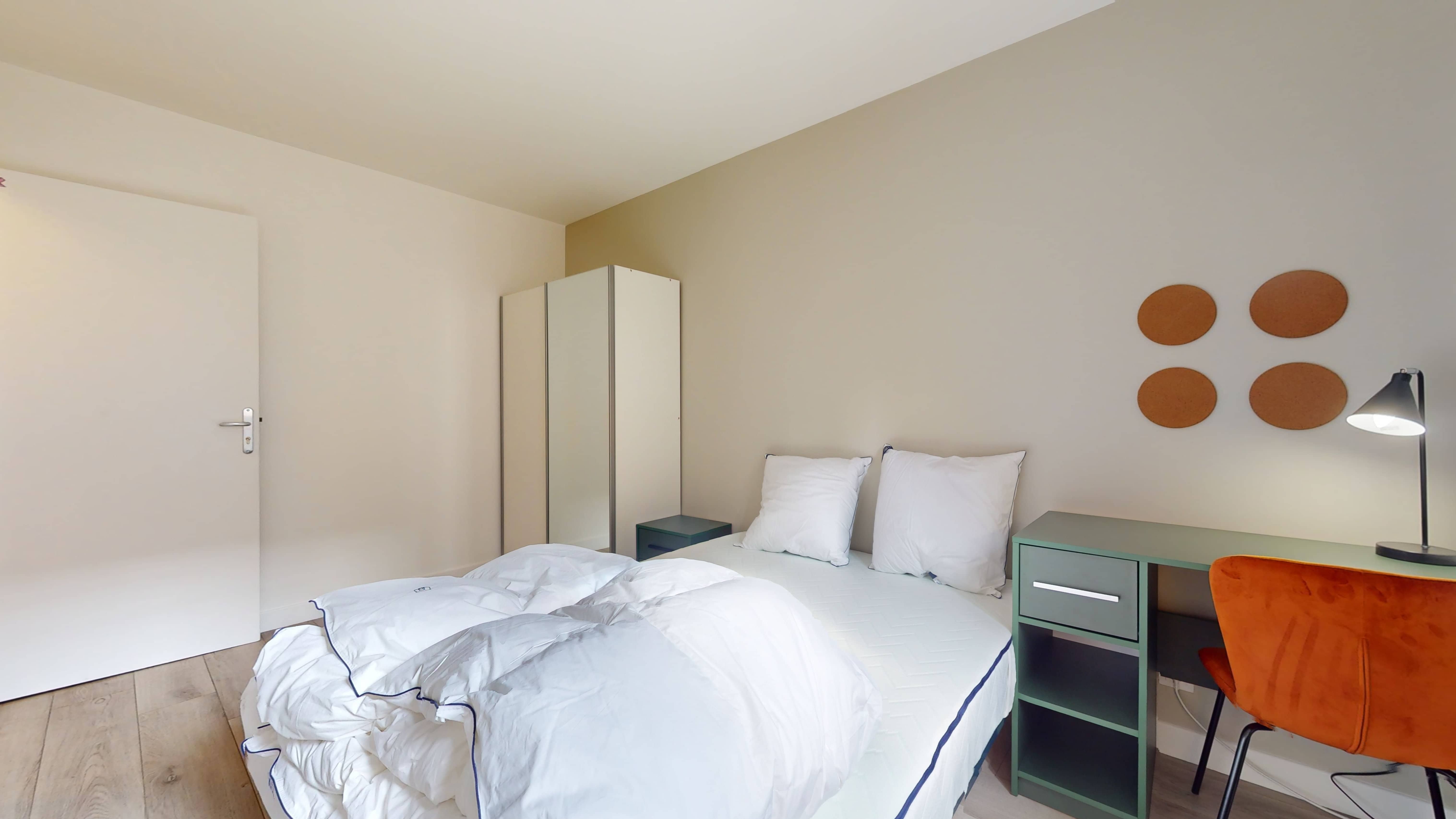 La chambre "Room 1", d'une superficie de 11 m², est parfaitement pensée pour une personne. Avec un lit double confortable, un grand bureau et une armoire, vous aurez tout l'espace pour vous reposer et travailler. La salle de bain est à partager avec les autres locataires, garantissant intimité et propreté.