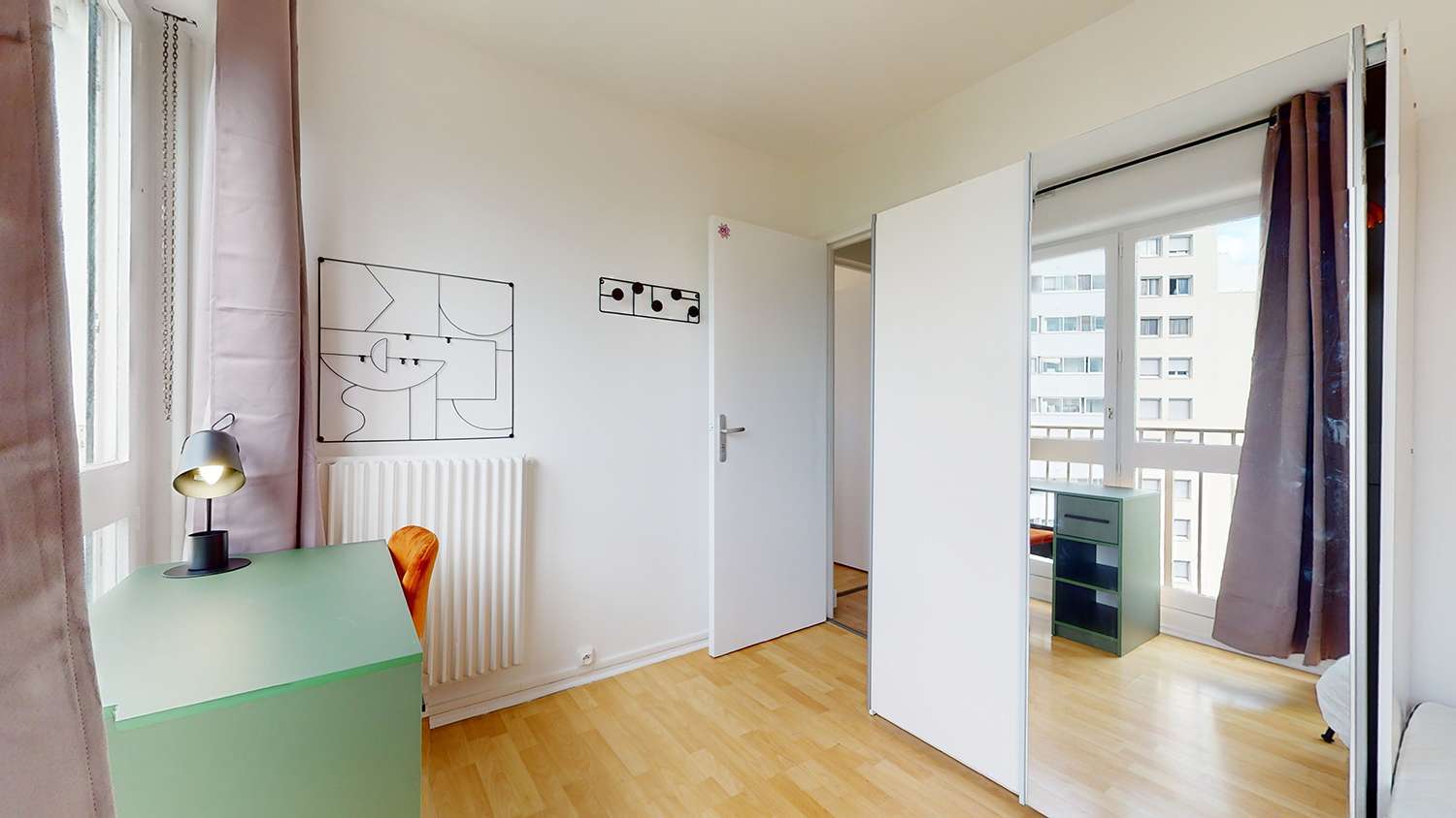 La chambre numéro 1 est parfaite pour une personne. Elle est meublée d'un lit double confortable, d'une armoire pour vos vêtements, d'une chaise et d'un bureau pour étudier ou travailler. La chambre mesure 9 m² et vous partagerez une salle de bain moderne avec d'autres locataires. La chambre est également équipée d'un radiateur pour rester au chaud, de rideaux pour votre intimité et d'une connexion internet rapide.