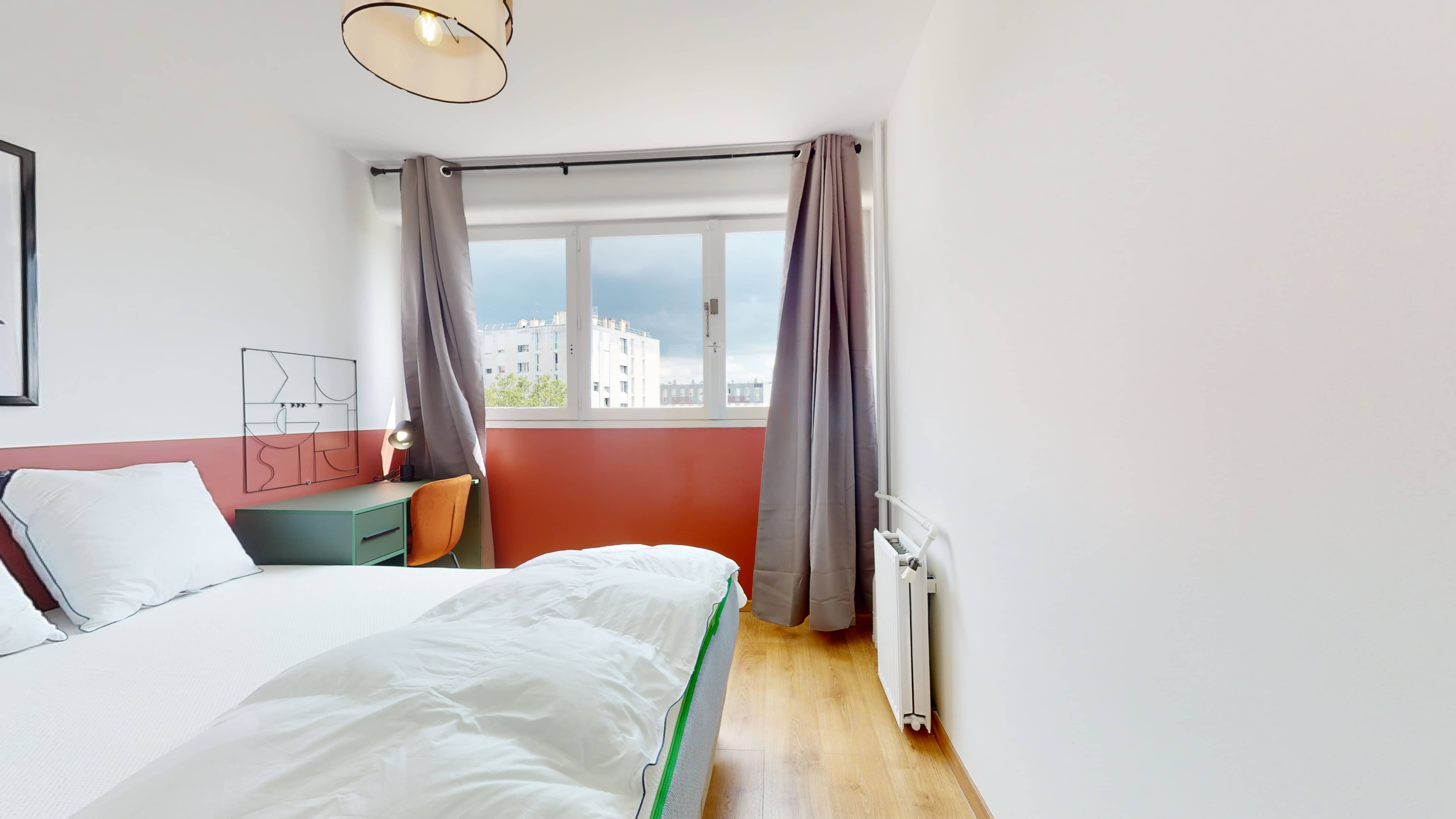 La chambre Room 1, d'une superficie de 10 m², est idéale pour une personne. Elle est meublée d'un lit double confortable, d'une armoire pour vos vêtements, ainsi qu'un bureau et une chaise pour travailler ou étudier. La chambre partage une salle de bain propre et équipée avec d'autres colocataires.