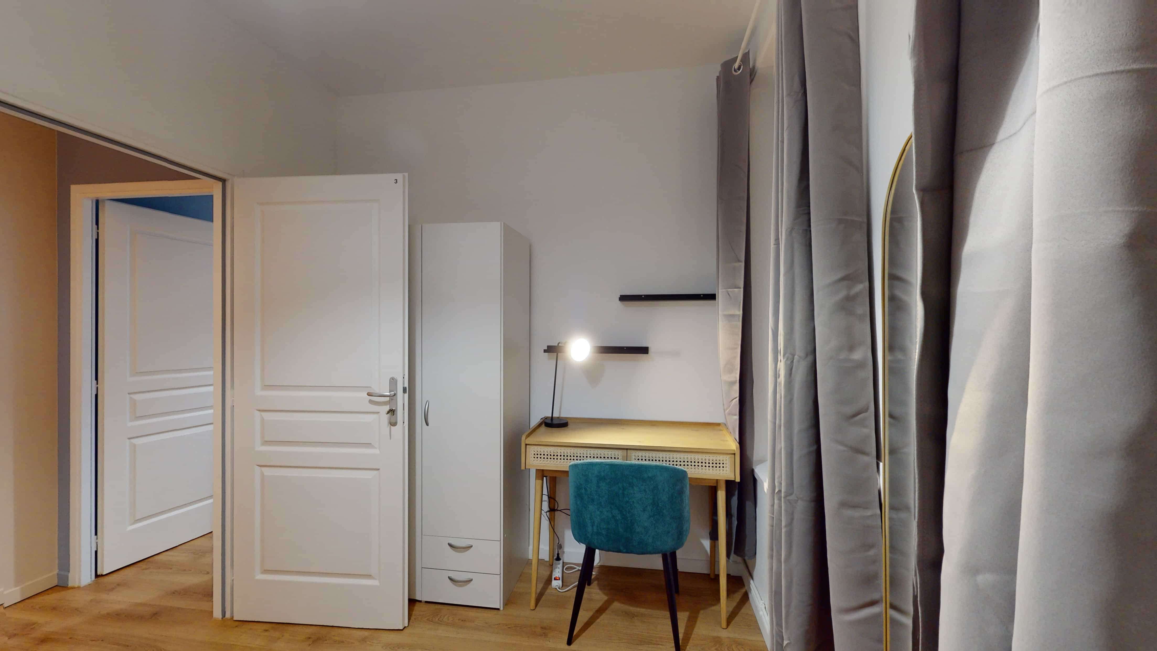 La chambre disponible, Room 3, est parfaitement agencée pour une personne avec son lit double confortable, une armoire pour vos affaires, un bureau pour travailler et une chaise. Elle partage une salle de bain moderne avec d'autres locataires, ce qui garantit propreté et praticité.