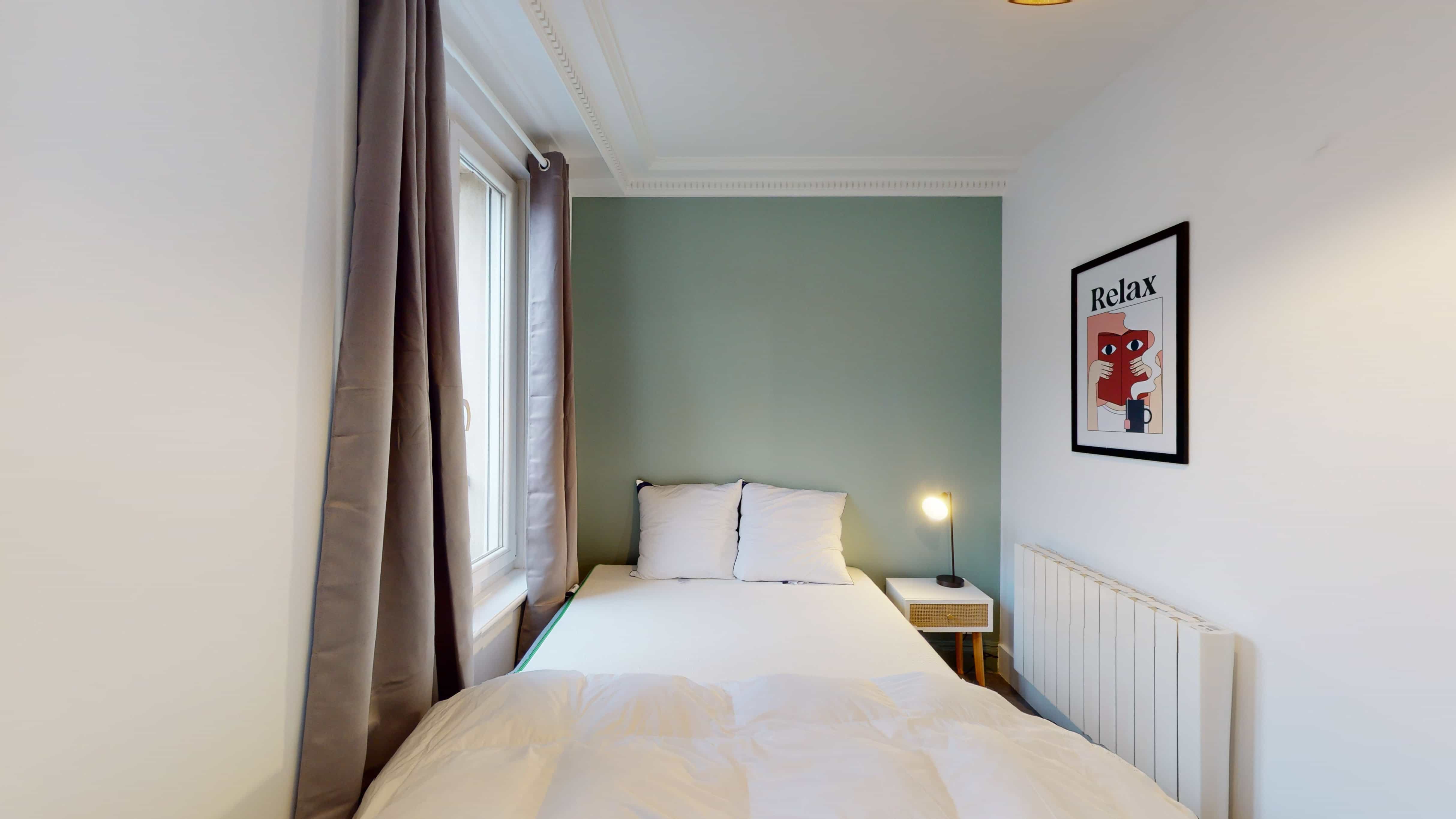 La chambre "Room 1" de 11 m² est parfaite pour une personne. Elle est meublée d'un lit double confortable, une armoire pour vos affaires, un bureau pour travailler et une chaise. La chambre partage une salle de bain pratique avec douche, lavabo et toilettes avec d'autres locataires.