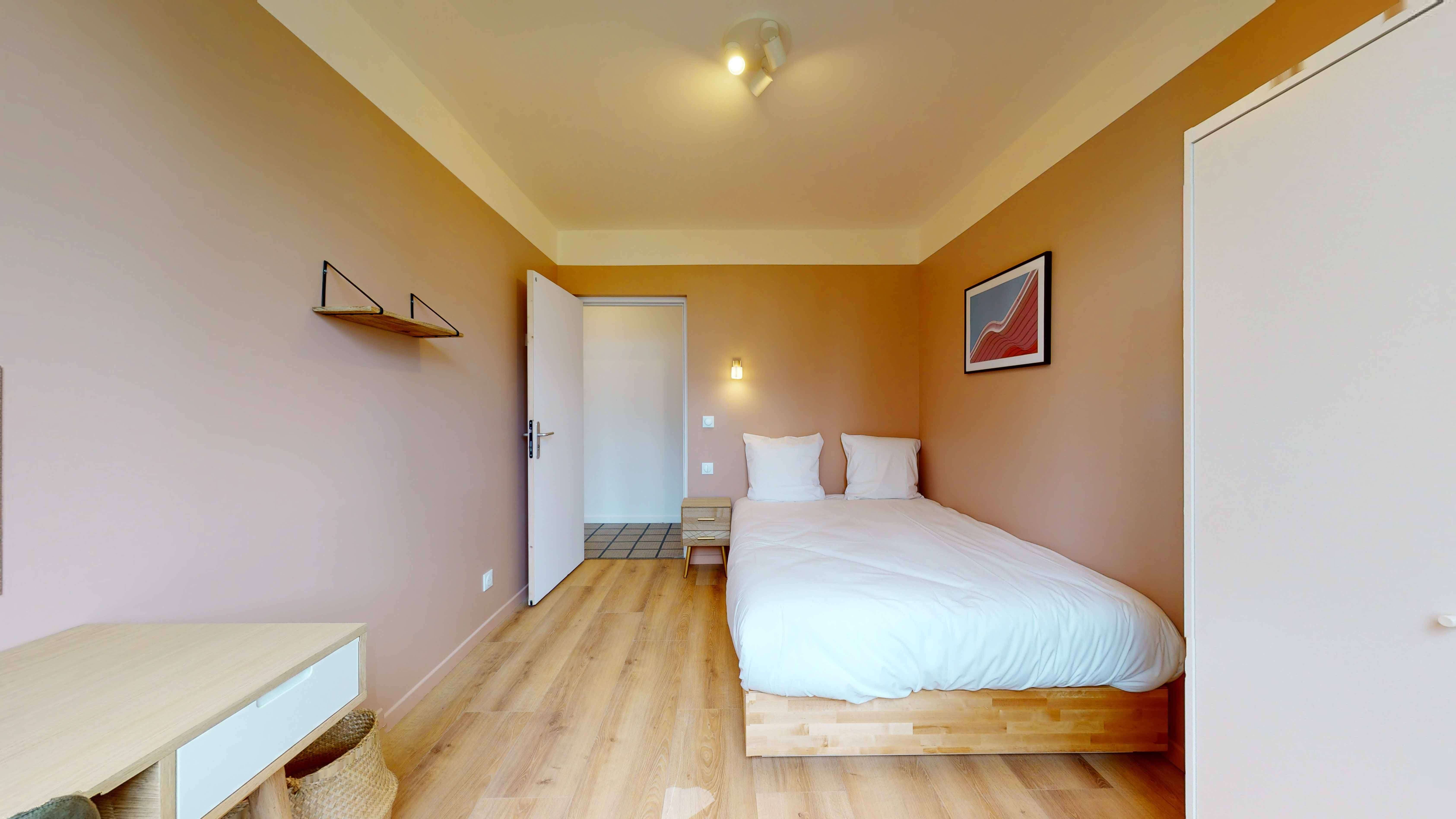 La chambre "Room for one person - 6" est un cocon douillet de 10m² situé au rez-de-chaussée. Elle est conçue pour une personne et comprend un lit double avec une literie de qualité, une armoire pour vos affaires, ainsi qu'un bureau avec chaise et lampes pour étudier ou travailler confortablement. La chambre partage une salle de bain moderne avec douche et lavabo avec un autre locataire.