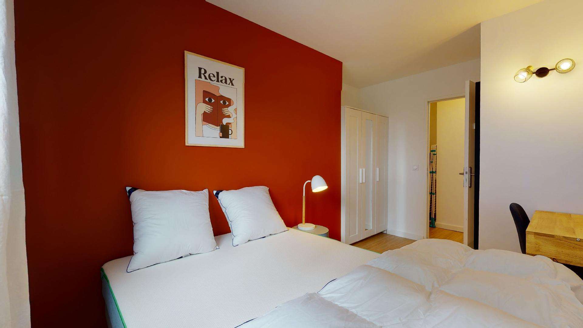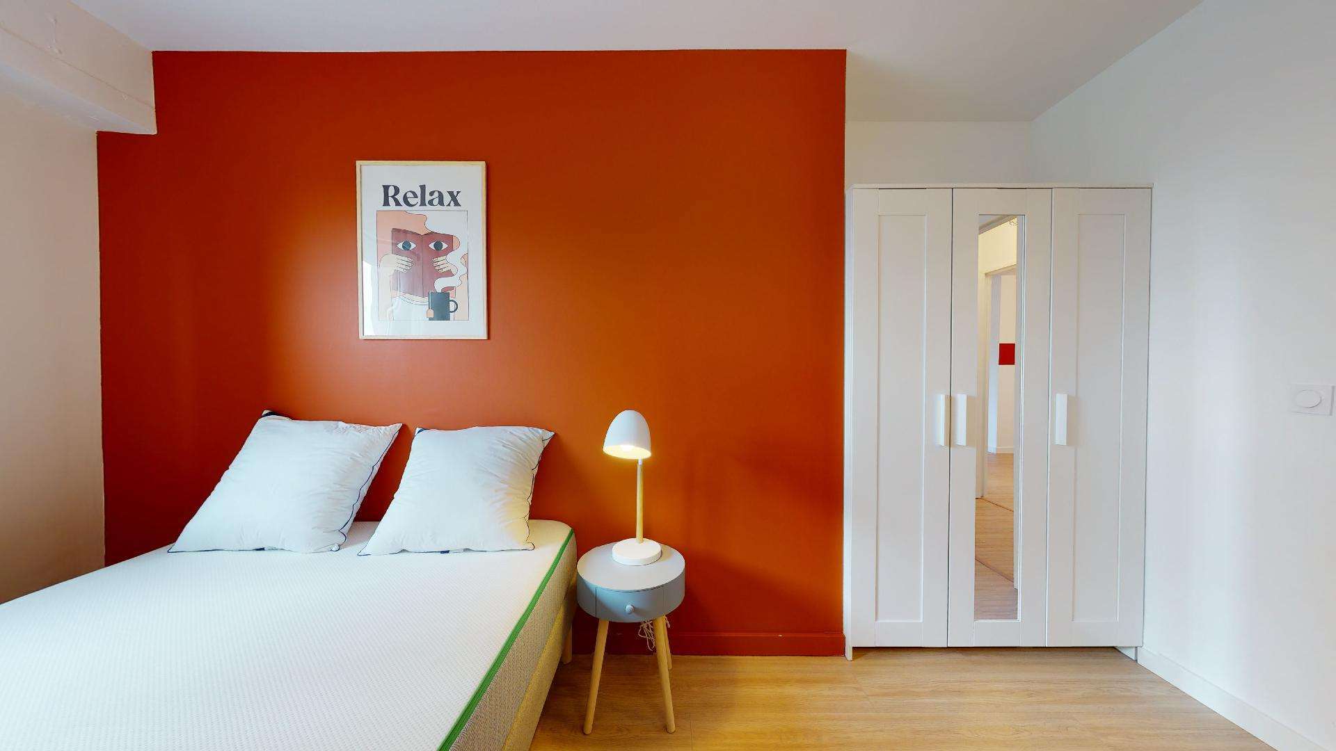 La chambre numéro 3, juste pour vous, est meublée avec un lit double confortable, une armoire pour vos vêtements, un bureau et une chaise pour étudier ou travailler. Elle mesure 9 m² et partage une salle de bain avec douche et toilettes avec d'autres locataires.