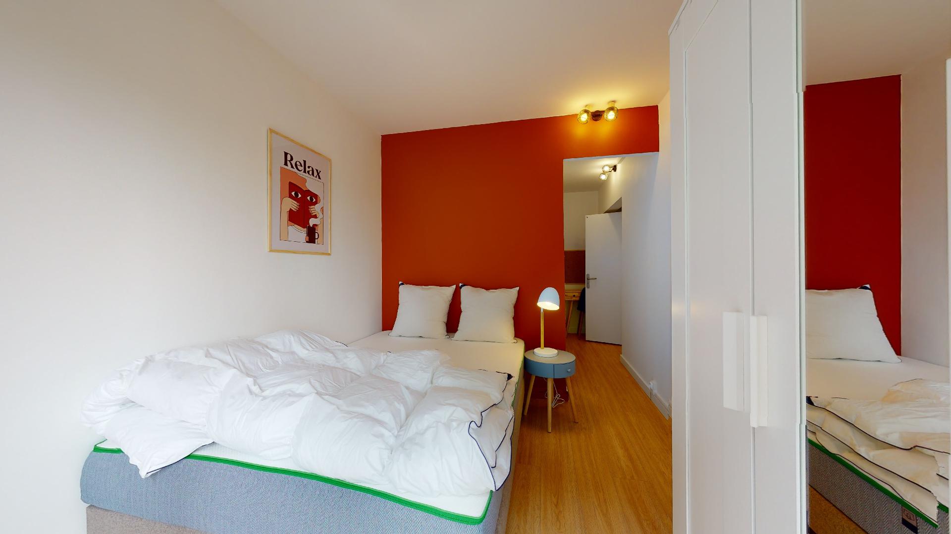 La chambre "Room 5" est parfaite pour une personne. Elle dispose d'un lit double confortable, d'une armoire pour ranger vos affaires, d'un bureau avec une chaise et une lampe pour travailler ou étudier, et d'un radiateur pour garder la pièce bien au chaud. Cette chambre partage une salle de bain moderne avec douche et toilettes avec les autres locataires.