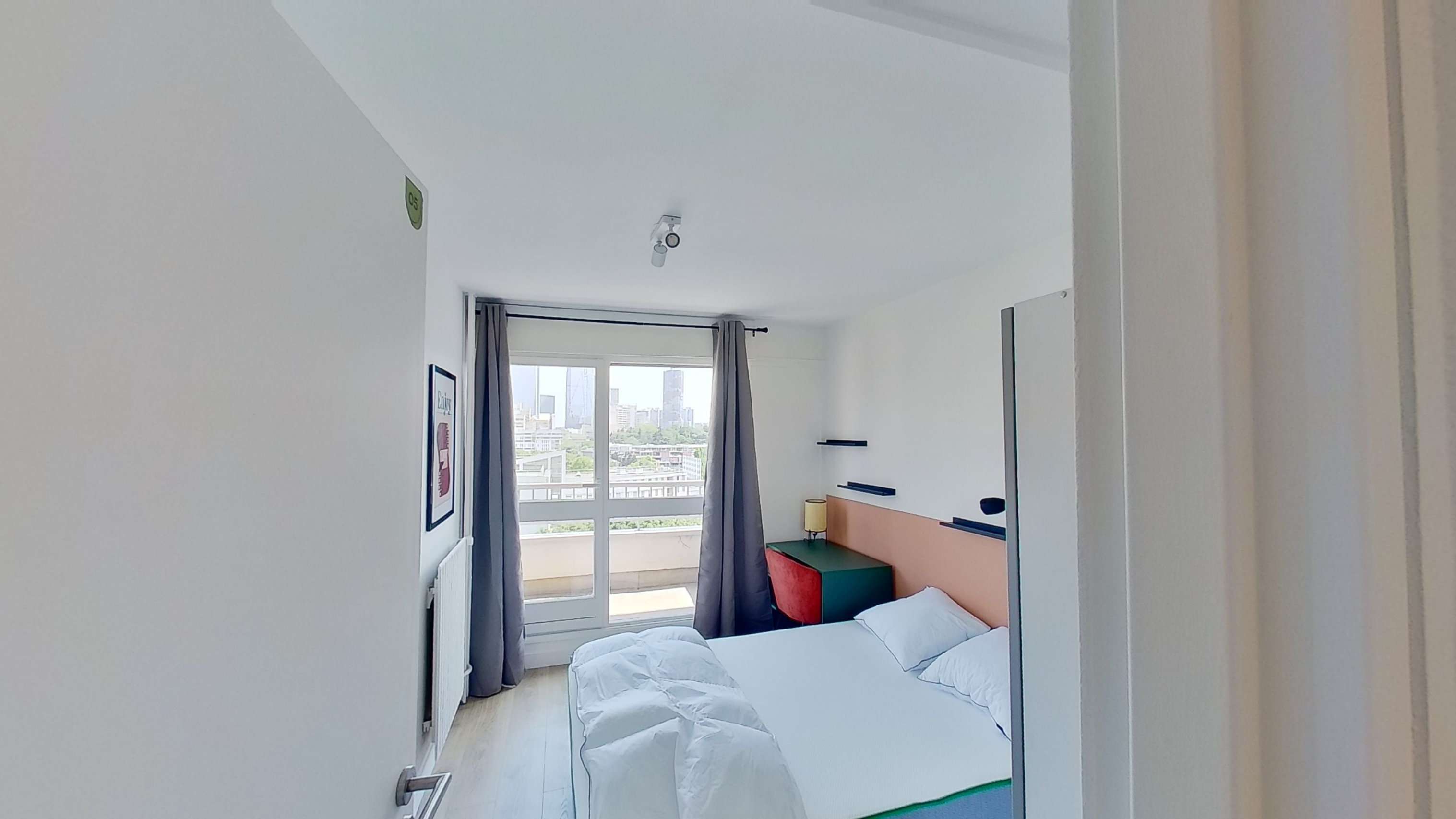 La chambre Room 5 est un petit cocon privé de 10 m² avec un lit double confortable, une armoire pour vos affaires, une chaise et un bureau pour étudier ou travailler. Vous aurez aussi un balcon pour prendre l'air sans quitter votre chambre. La salle de bain est partagée et comprend tout ce dont vous avez besoin.
