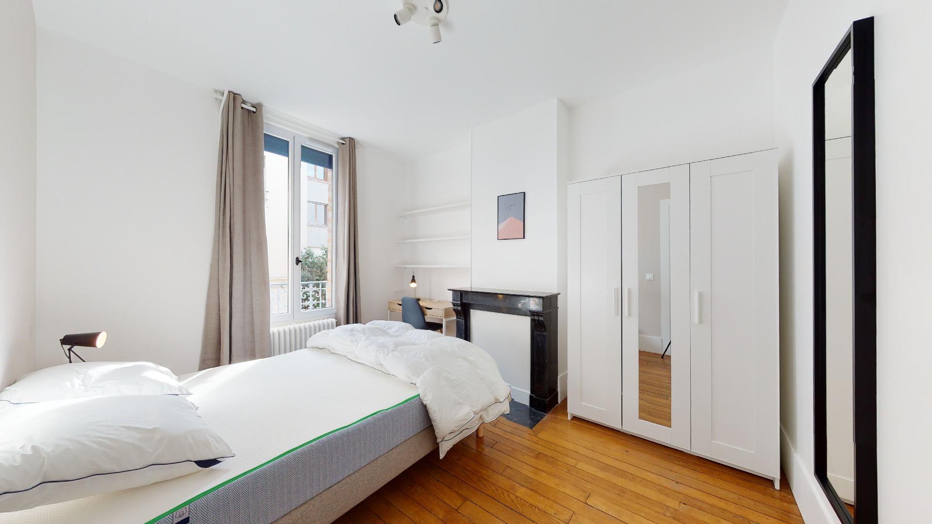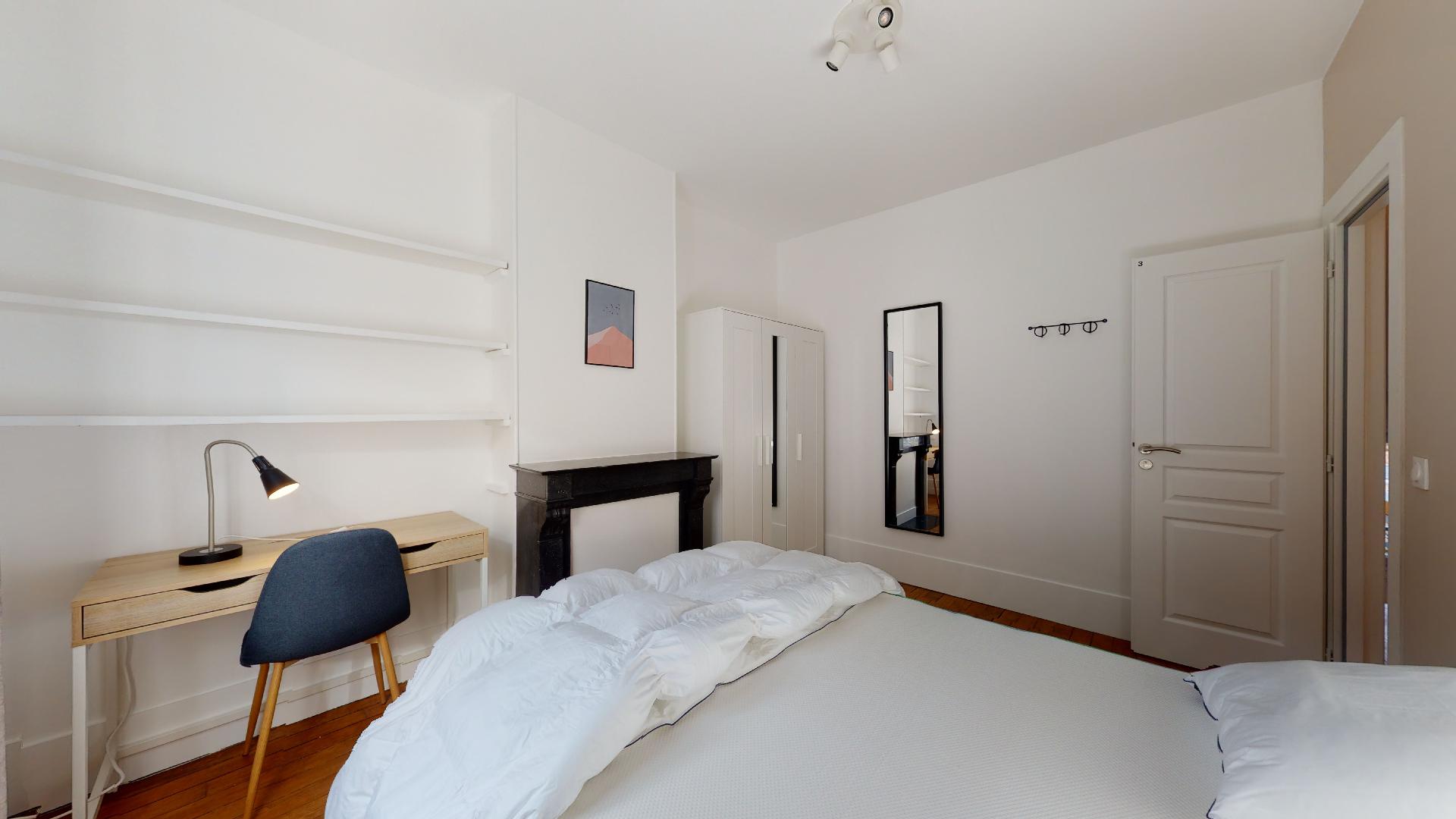 La chambre 3, d'une superficie de 11 m², est parfaite pour une personne. Elle est meublée avec un lit double confortable, une armoire pour ranger vos affaires, un bureau et une chaise pour étudier ou travailler, et même une lampe de chevet pour vos lectures nocturnes. Partageant une salle de bains avec douche et toilettes avec d'autres locataires, cette chambre est un véritable cocon personnel.