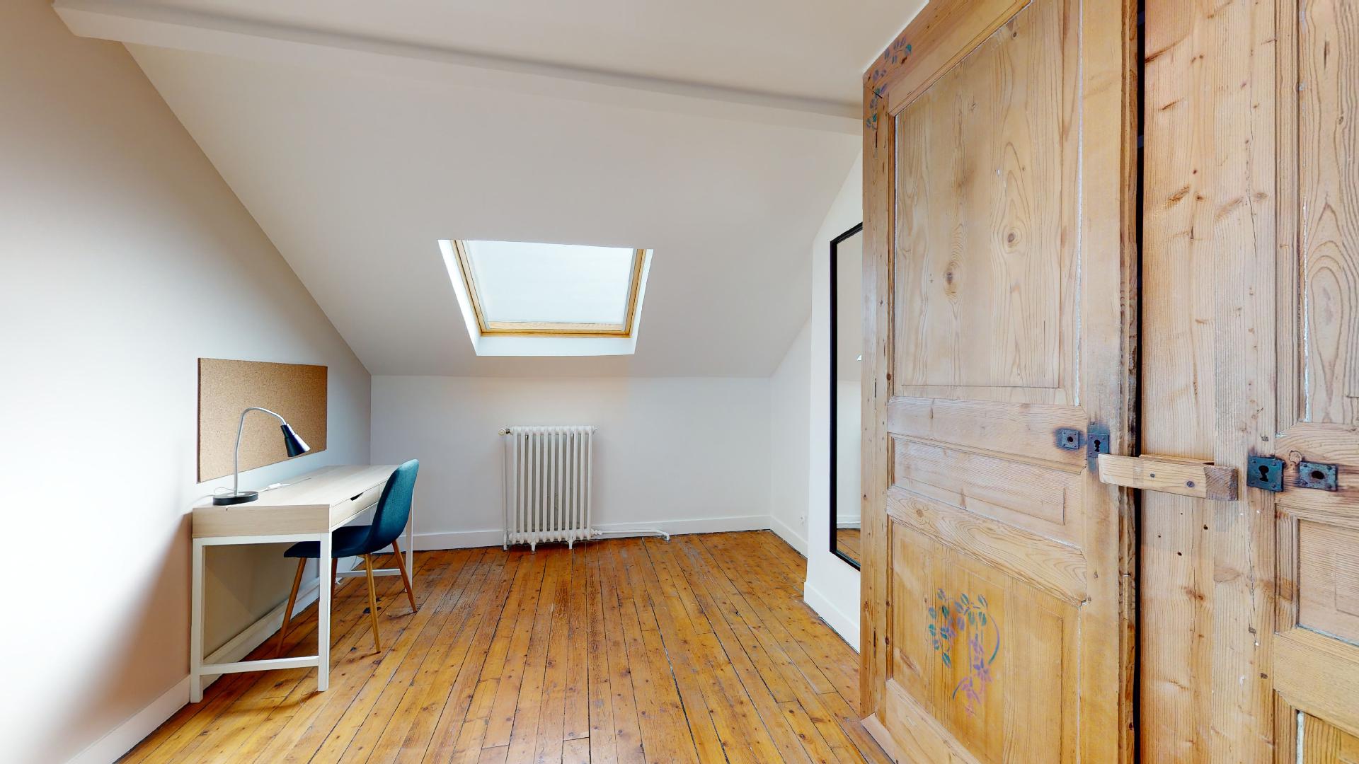La chambre 5 est votre espace personnel de 14 m², parfaitement aménagée pour un confort quotidien. Elle dispose d'un lit double avec des draps haut de gamme pour bien dormir, une armoire pour ranger vos affaires, un bureau et une chaise pour travailler ou étudier, et une table de nuit avec une lampe. Vous partagerez une salle de bains moderne avec douche et toilettes avec d'autres locataires.