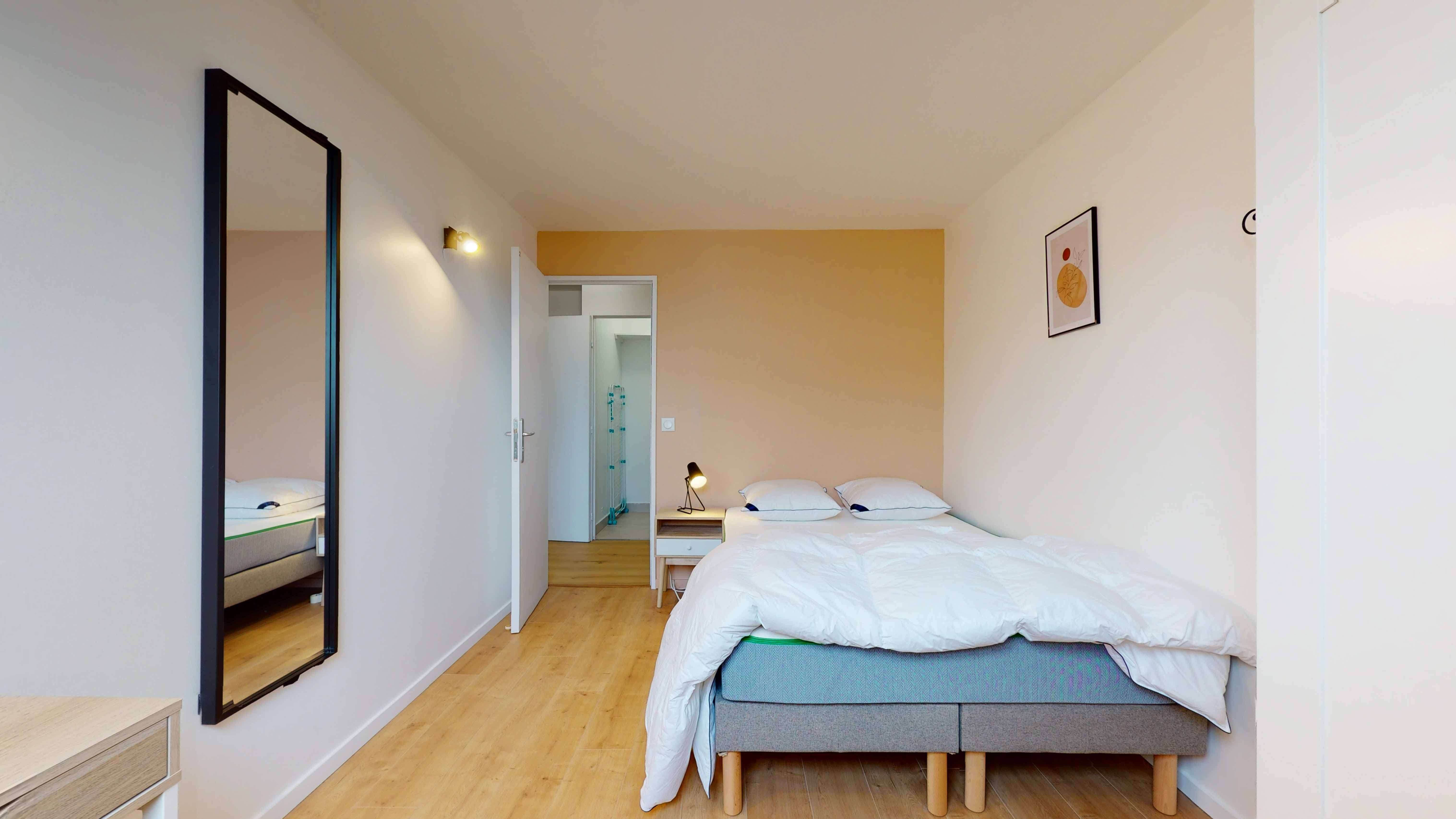 Room 2 est une chambre confortable conçue pour une personne. Elle dispose d'un lit double avec des draps de qualité, d'une armoire pour ranger vos affaires, d'un bureau et d'une chaise pour travailler ou étudier. Cette chambre partage une salle d'eau bien entretenue avec douche, lavabo et toilettes.