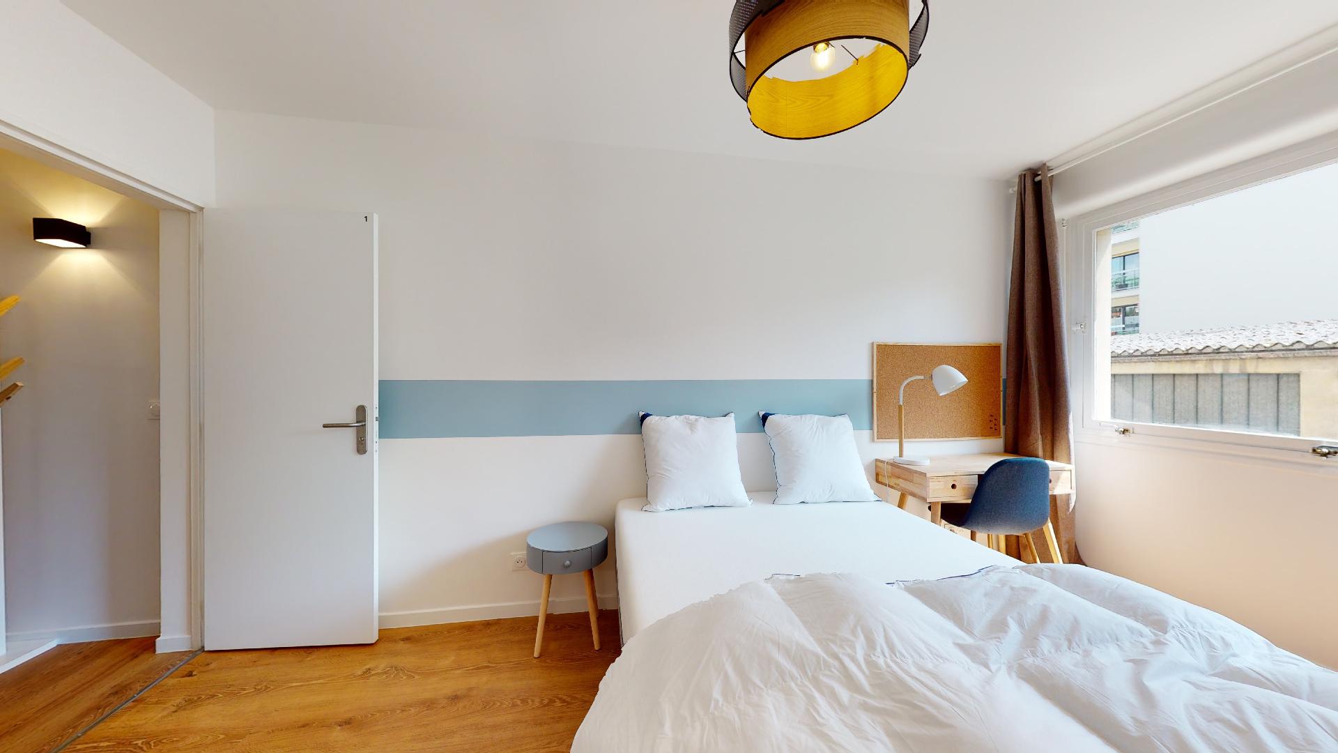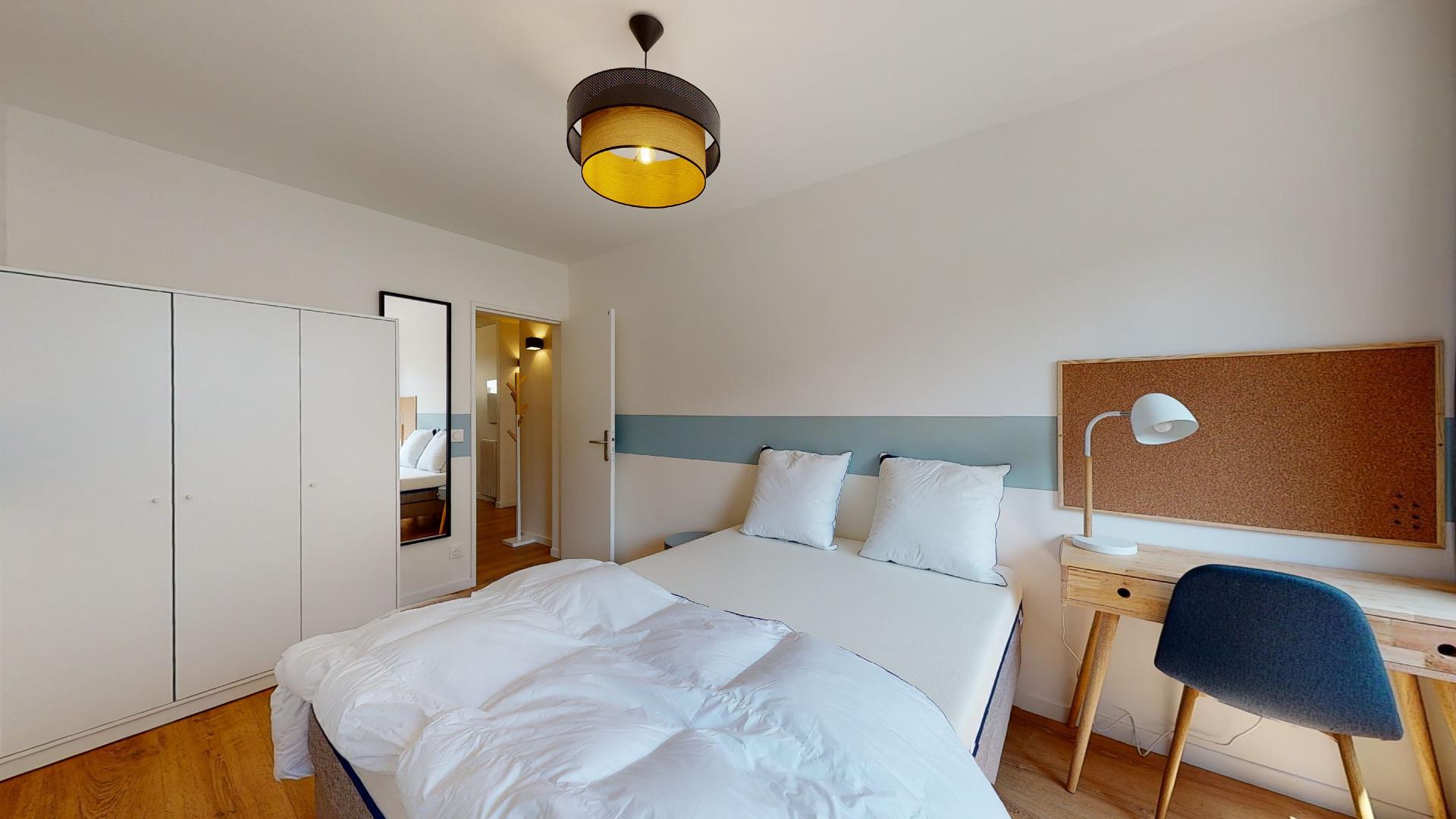 La chambre 1, conçue pour une personne, est un espace personnel et confortable de 12 m². Elle est aménagée avec un lit double, une armoire pour ranger toutes vos affaires, une chaise, un bureau pour travailler ou étudier, et une lampe de bureau. La chambre bénéficie également d'un radiateur pour rester au chaud et d'une salle de bain partagée avec des équipements modernes.