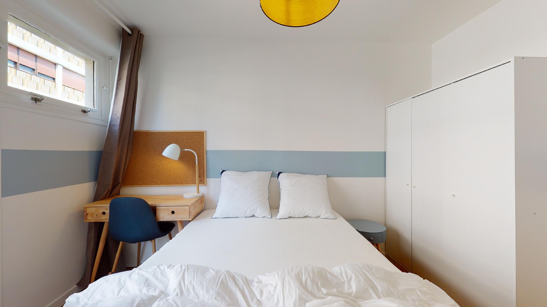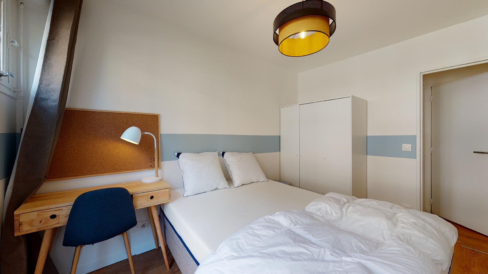 Room 3 est juste ce qu'il vous faut : conçue pour une personne, elle dispose d'un lit double confortable, d'une armoire pour vos vêtements, d'un bureau avec sa chaise et lampe pour étudier ou travailler, et d'une salle de bain partagée. Avec ses 9 m², c'est un espace intime et bien organisé.