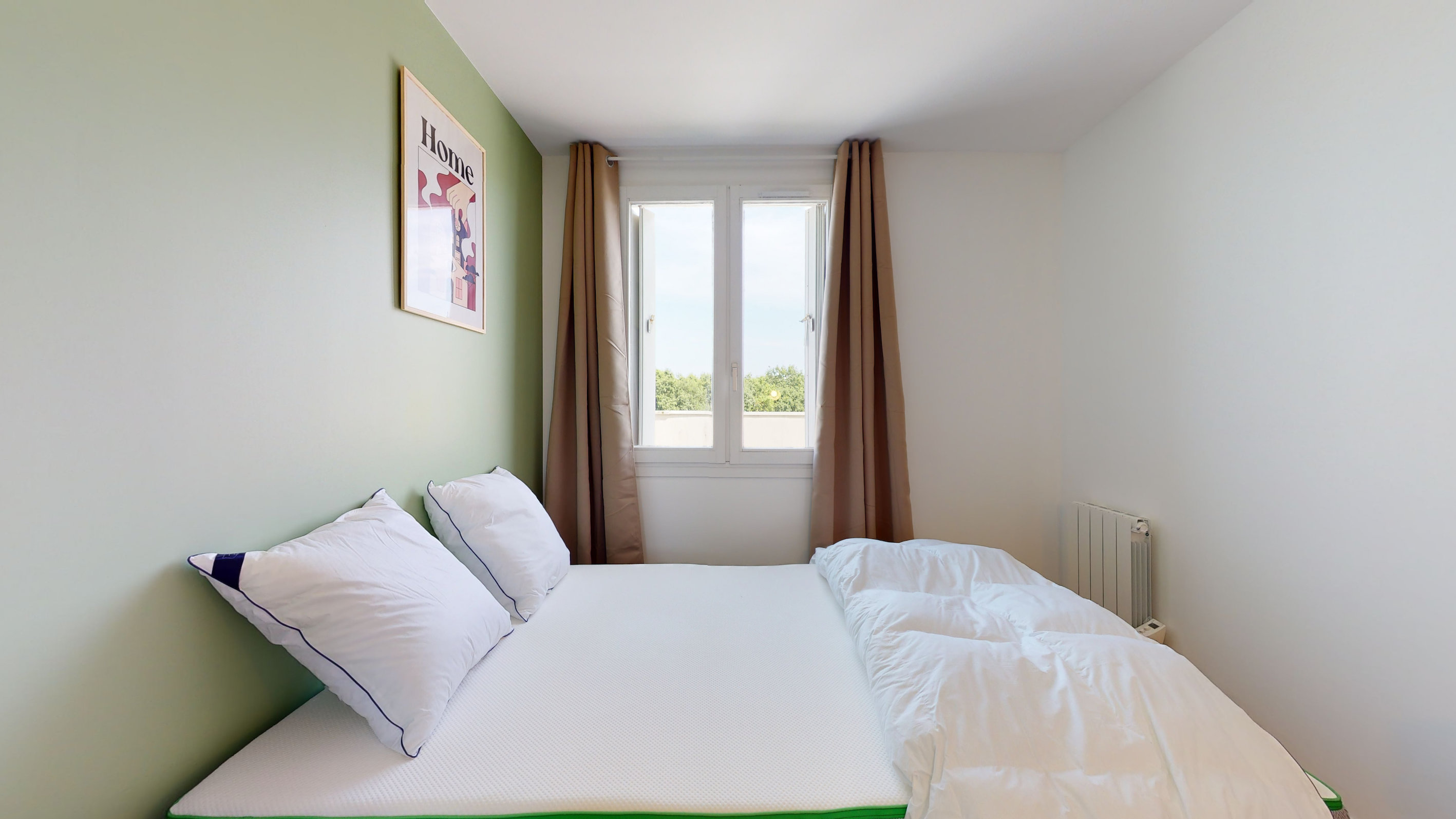 La chambre Room 2 est prête à accueillir une personne avec tout le nécessaire pour se sentir chez soi : un lit double confortable avec de la literie de qualité, une armoire pour ranger vos affaires, ainsi qu'une chaise et un bureau pour étudier ou travailler en toute tranquillité. Cette chambre partage une salle de bain moderne équipée d'une douche, d'un lavabo et de toilettes avec d'autres résidents.
