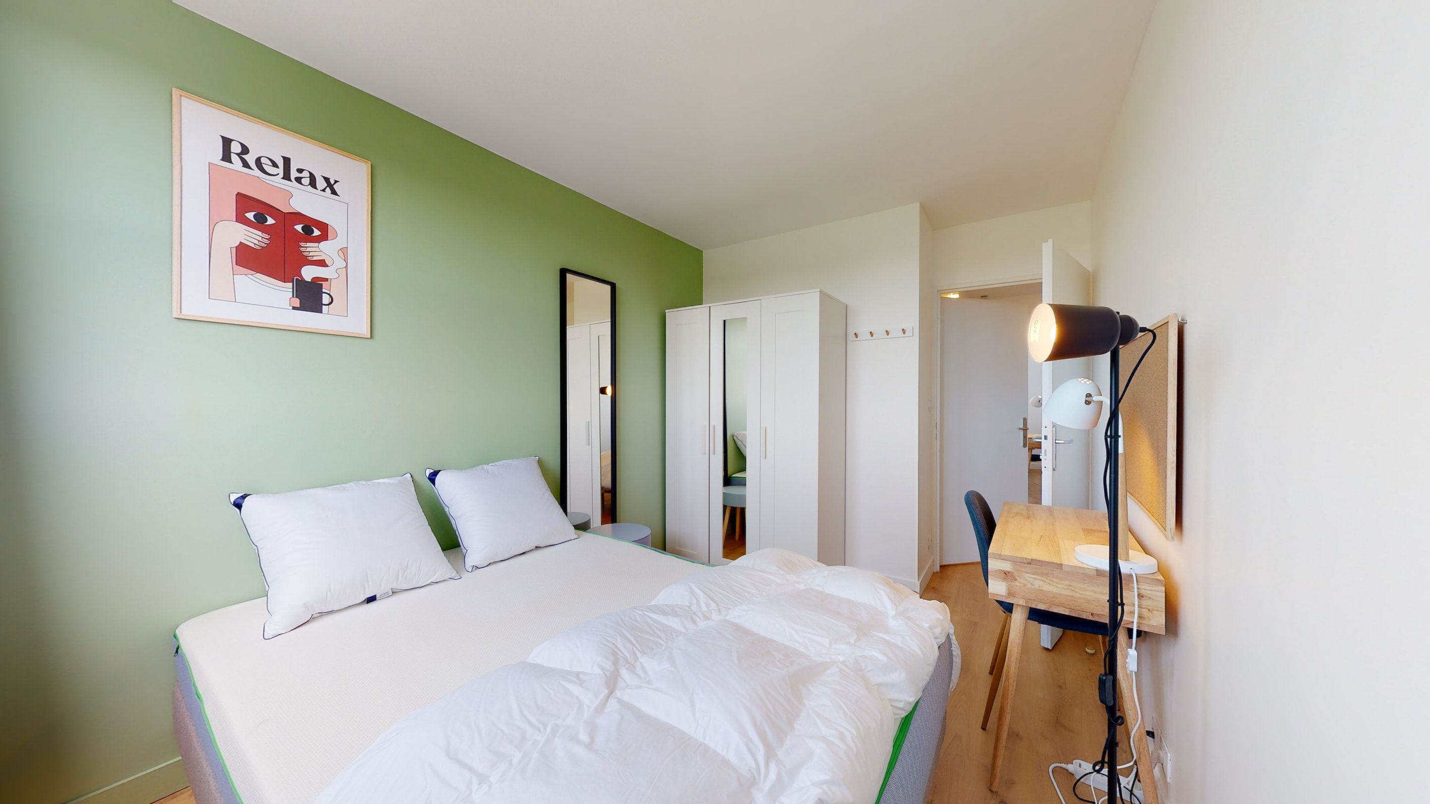 La chambre 4 est spécialement conçue pour une personne et offre tout le confort nécessaire. Équipée d'un lit double avec une literie de qualité, d'une armoire pour vos affaires, d'un bureau pour travailler et d'une chaise, elle est idéale pour étudier ou se reposer. Partageant une salle de bain avec douche, lavabo et toilettes, cette chambre de 9m² est un petit cocon privé au sein de l'appartement.