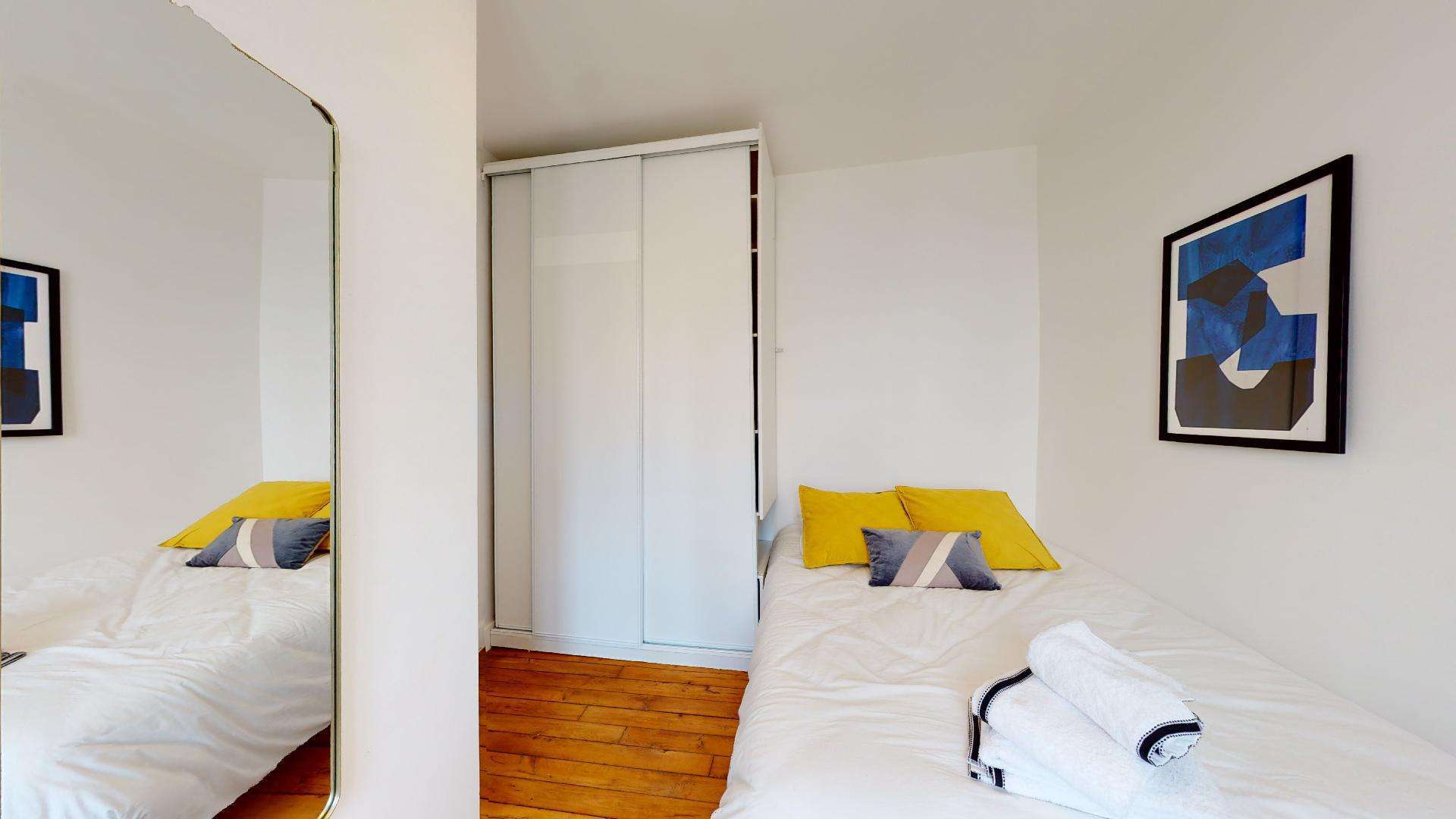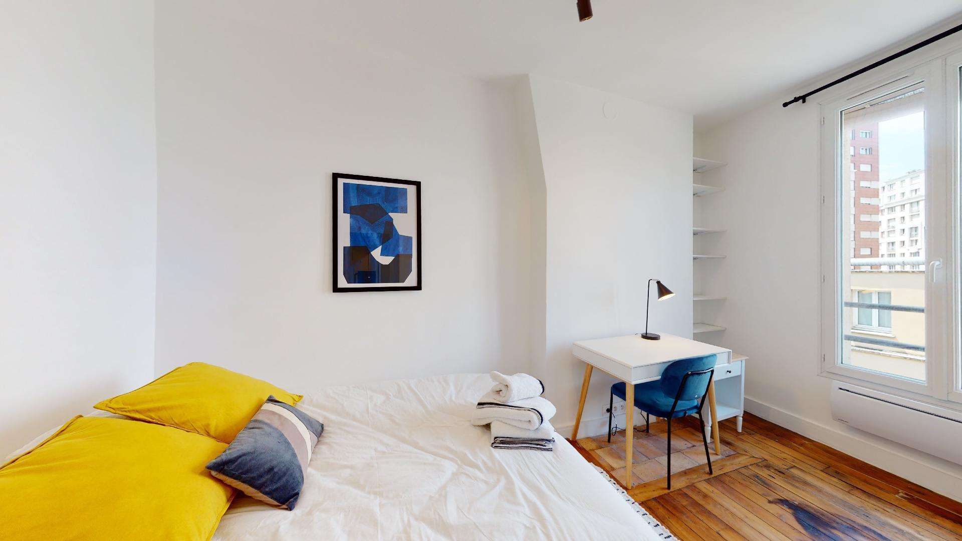 La chambre, conçue pour une personne, est un petit cocon de 9 m² avec tout ce qu'il faut : un lit double confortable, une armoire pour vos vêtements, un bureau et une chaise pour travailler, ainsi qu'une lampe de chevet. La qualité est au rendez-vous sans être luxueuse. La salle de bains est à partager et comprend une douche et des toilettes.
