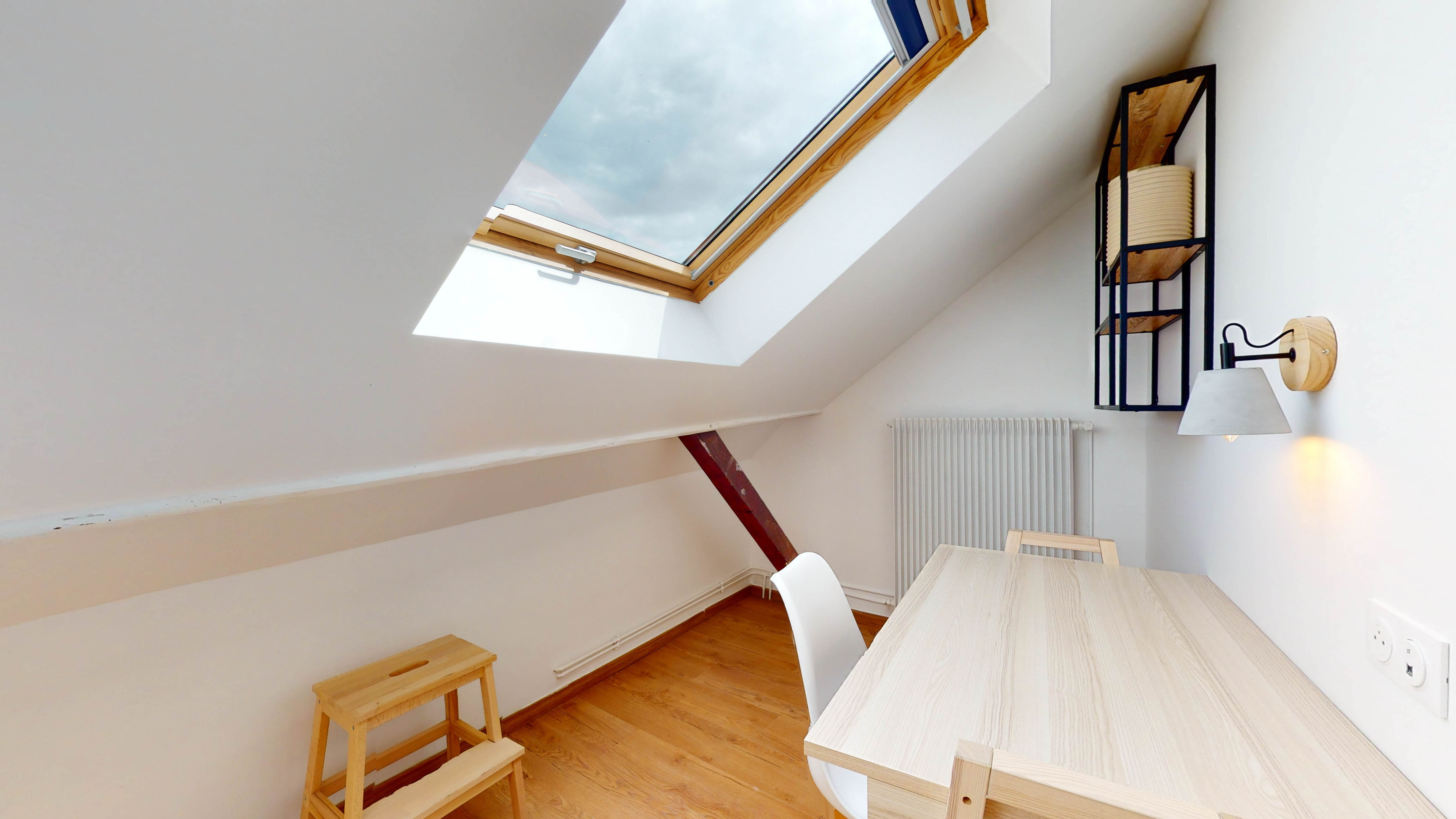 La chambre 10, située au deuxième étage, est conçue pour une personne. Elle est équipée d'un confortable lit double, d'un placard pour vos affaires, d'un bureau et d'une chaise pour travailler ou étudier, et d'une salle de bains privée avec douche. La chambre dispose aussi d'un radiateur pour rester au chaud, d'un miroir et d'une poubelle.