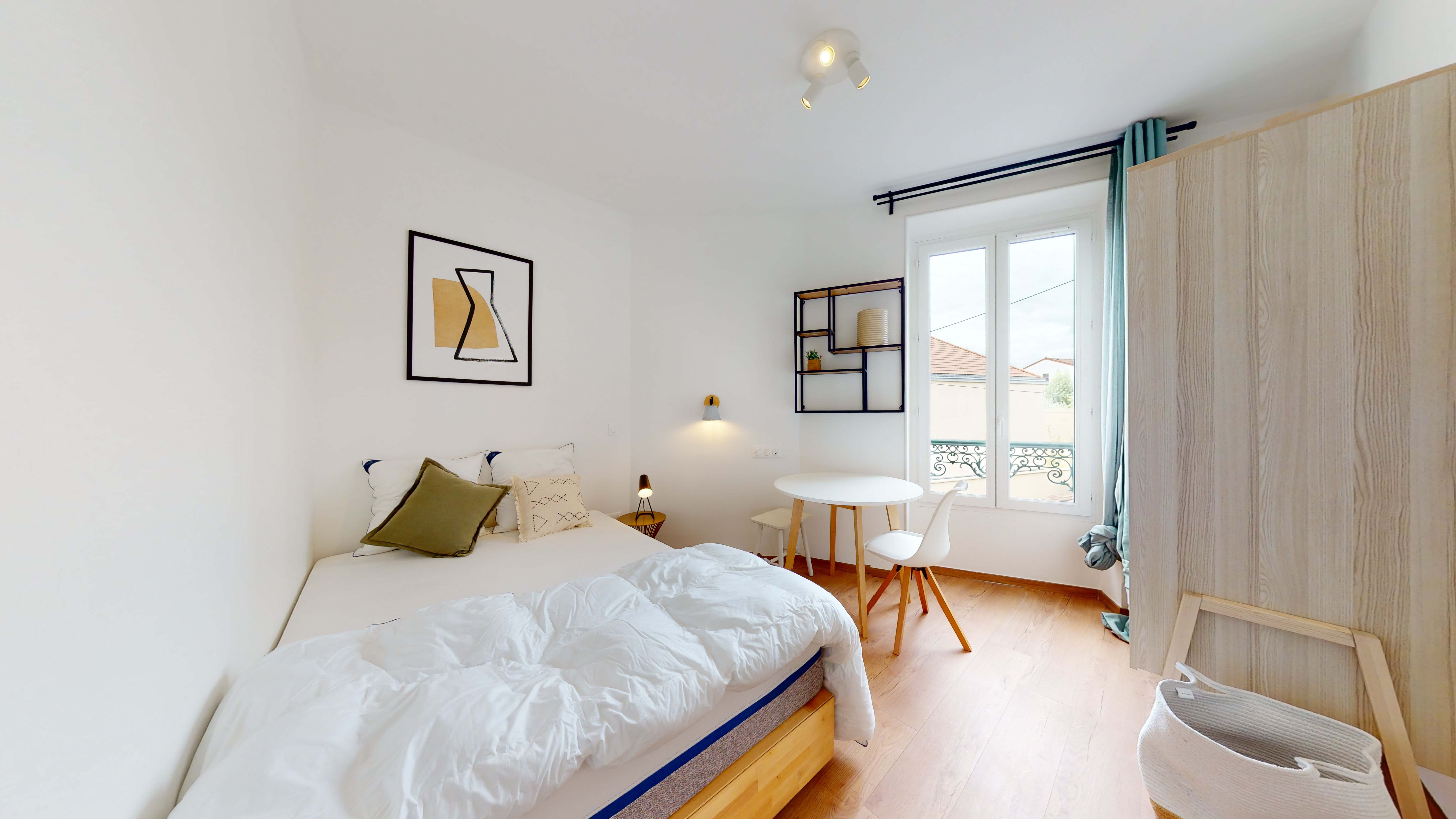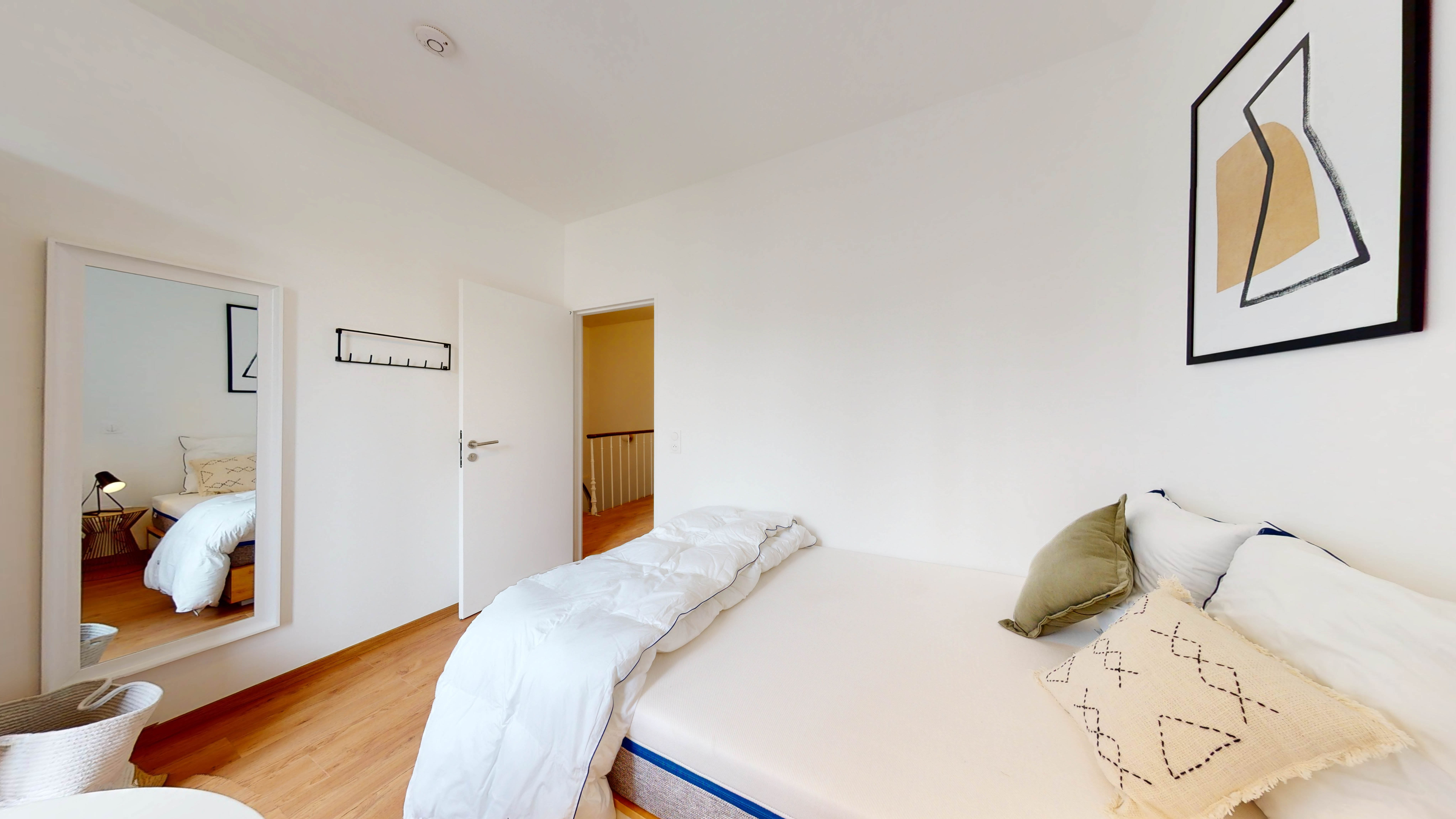 La Chambre 7, située au premier étage, est conçue pour accueillir confortablement une personne. Elle est équipée d'un lit double douillet, d'une armoire pour vos affaires, d'un bureau et d'une chaise pour travailler ou étudier en toute tranquillité. La chambre partage une salle de bain moderne avec douche et lavabo avec un autre locataire. Vous y trouverez également des draps propres, un miroir et une poubelle.