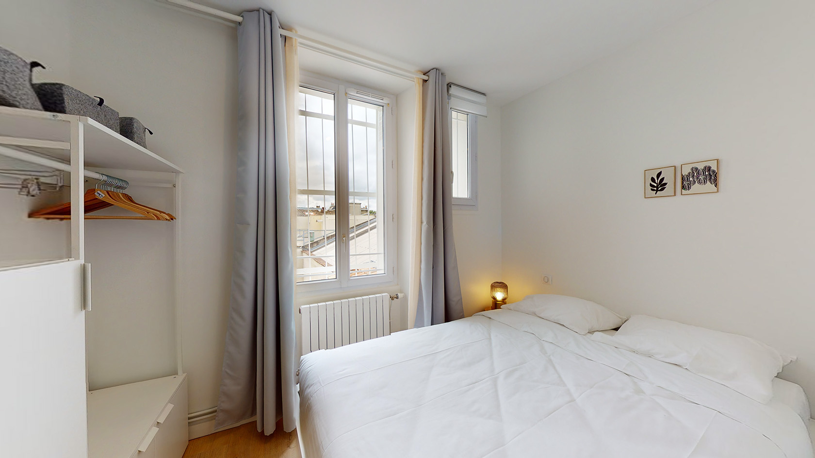 La chambre 12, située au deuxième étage, est un cocon juste pour vous. Elle est équipée d'un lit double avec rangement intégré, d'une armoire pour vos affaires, d'un bureau et d'une chaise pour travailler ou étudier dans le calme. La salle de bain privée comprend une douche moderne, un lavabo et des toilettes. Le chauffage est assuré par un radiateur, et la chambre est fournie avec des draps et une literie de qualité.