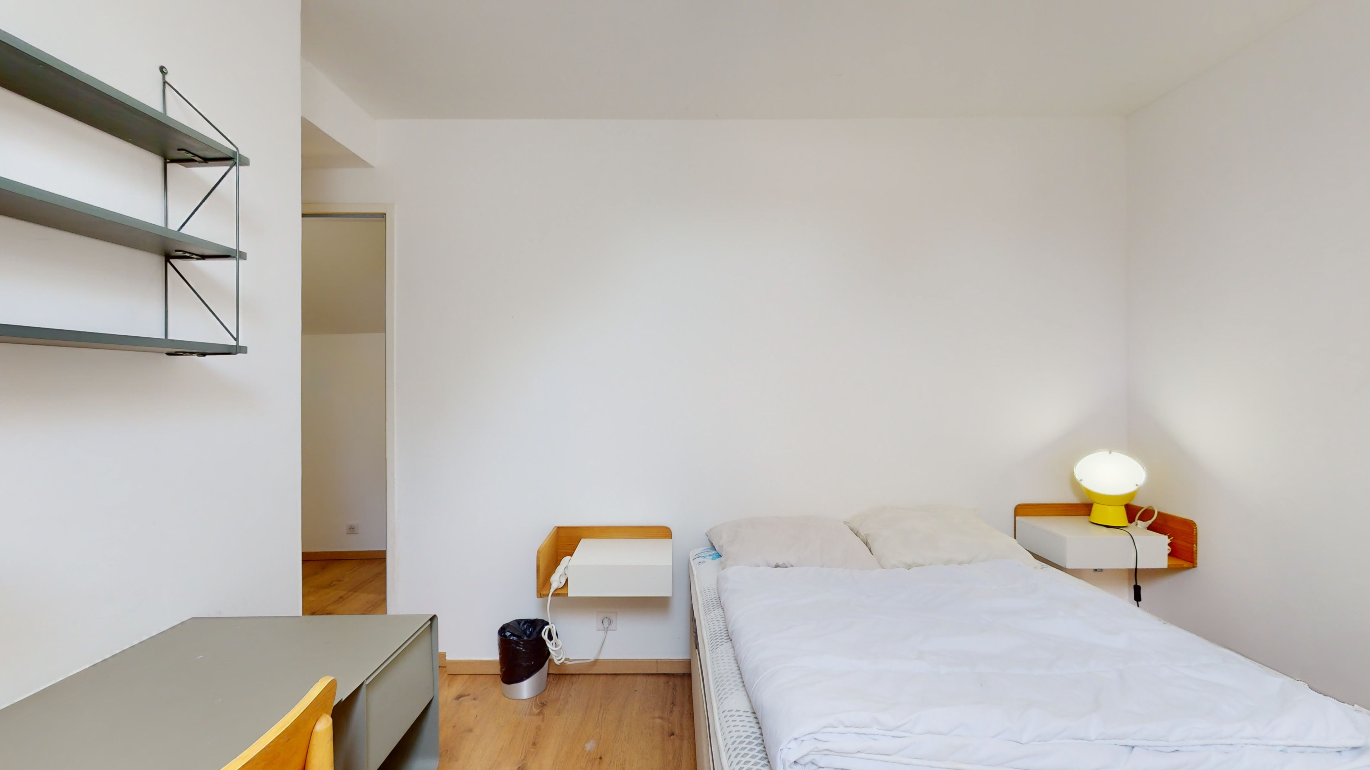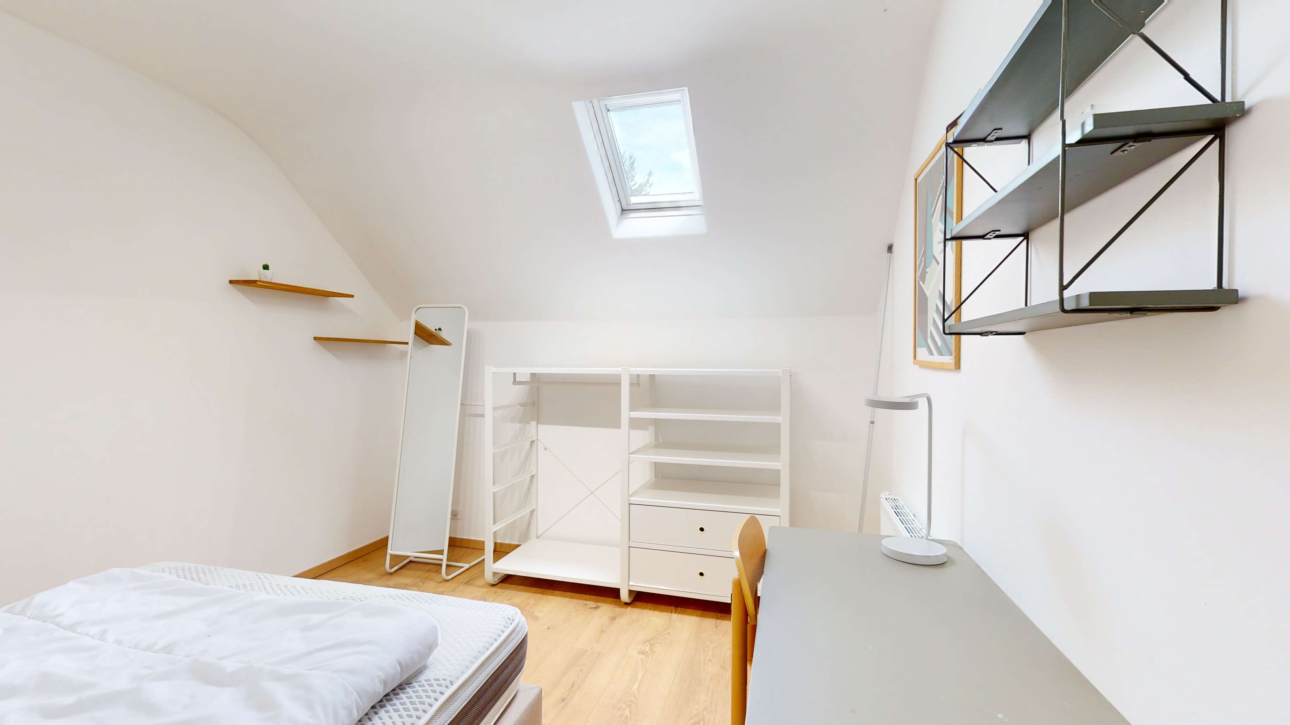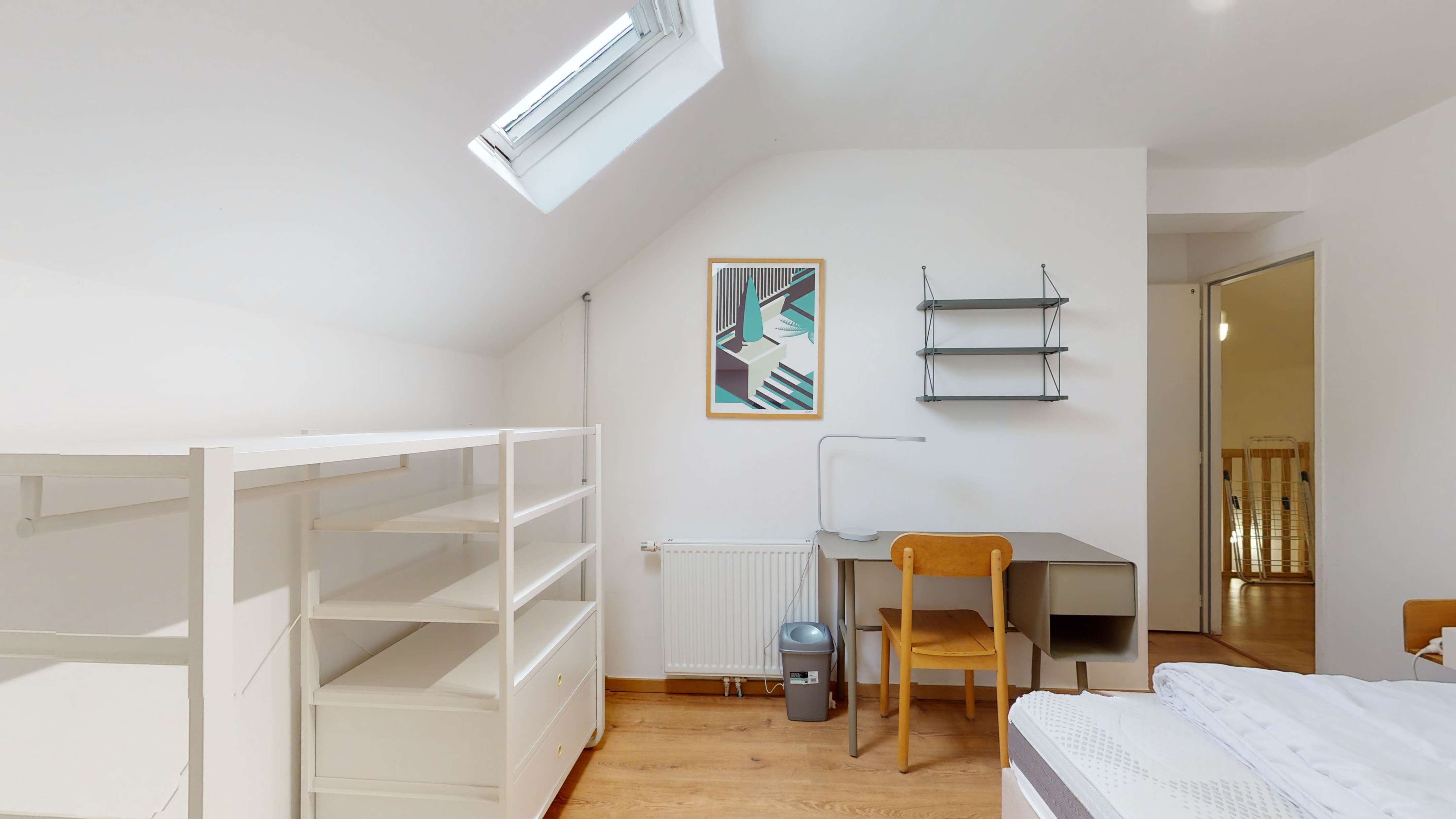 La chambre 9, située au premier étage de la maison donnant sur le jardin, est conçue pour une personne. Elle est équipée d'un lit confortable avec literie de qualité, d'une penderie pour vos vêtements, d'un bureau avec lampe pour travailler et d'une chaise. Cette unité privative offre également l'accès à une salle de bain partagée avec un autre locataire, comprenant une douche.