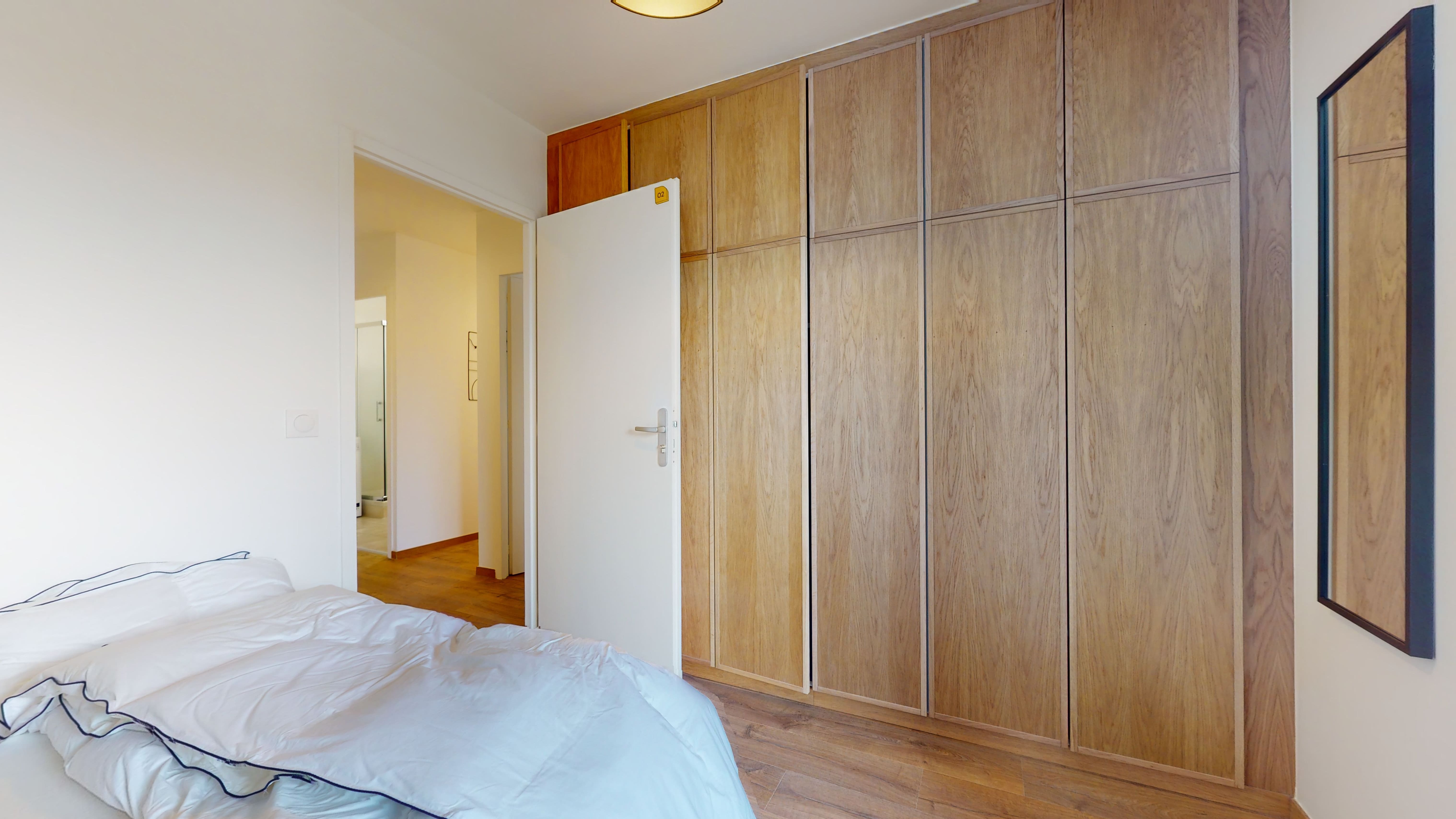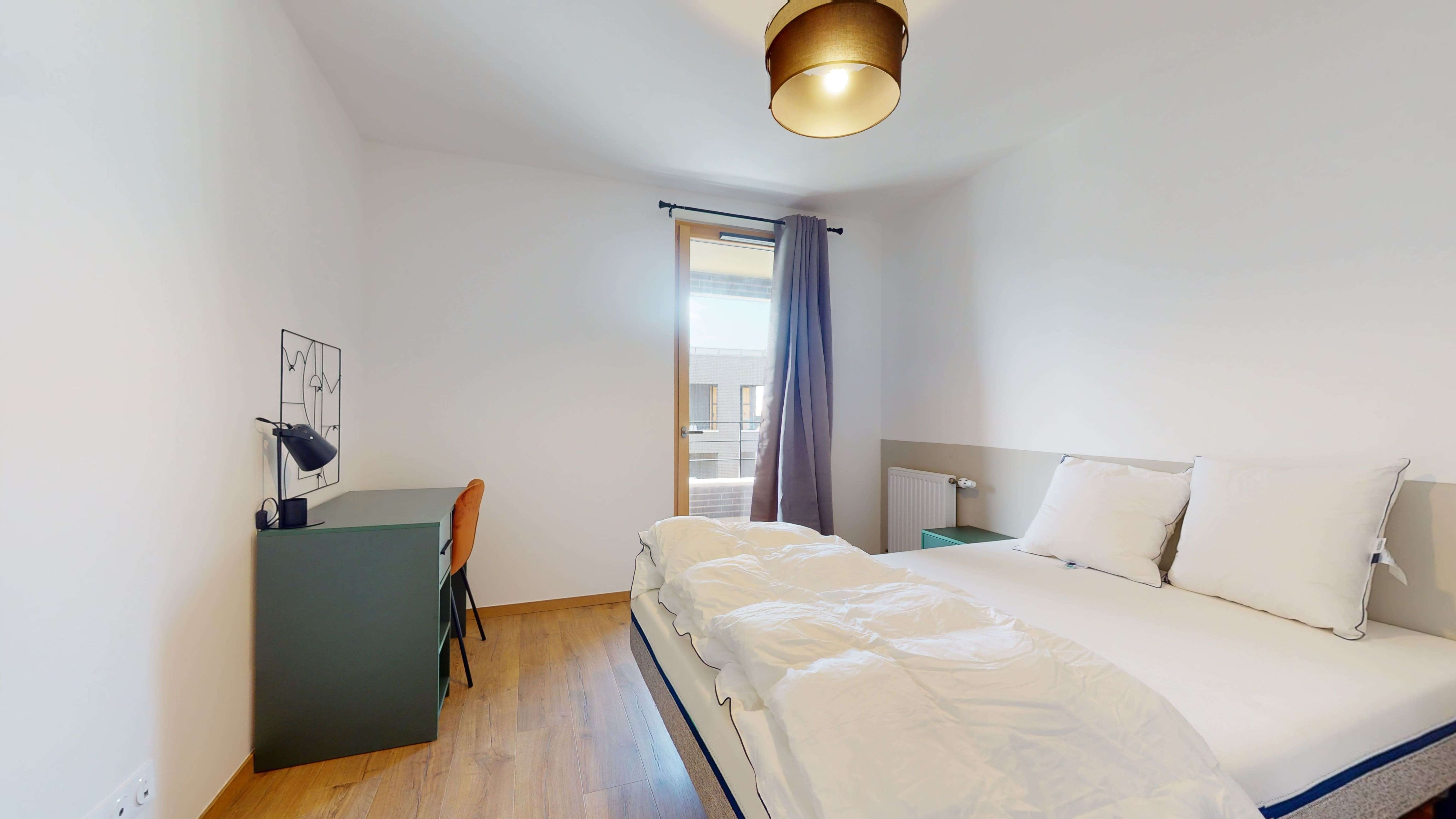 La chambre Room 1 est un petit cocon juste pour vous. Avec son lit double et sa literie de qualité, dormir sera un plaisir. Vous y trouverez aussi une armoire pour vos affaires, un bureau pour travailler au calme et un accès à un balcon pour prendre l'air. La chambre partage une salle de bain bien équipée avec d'autres locataires.