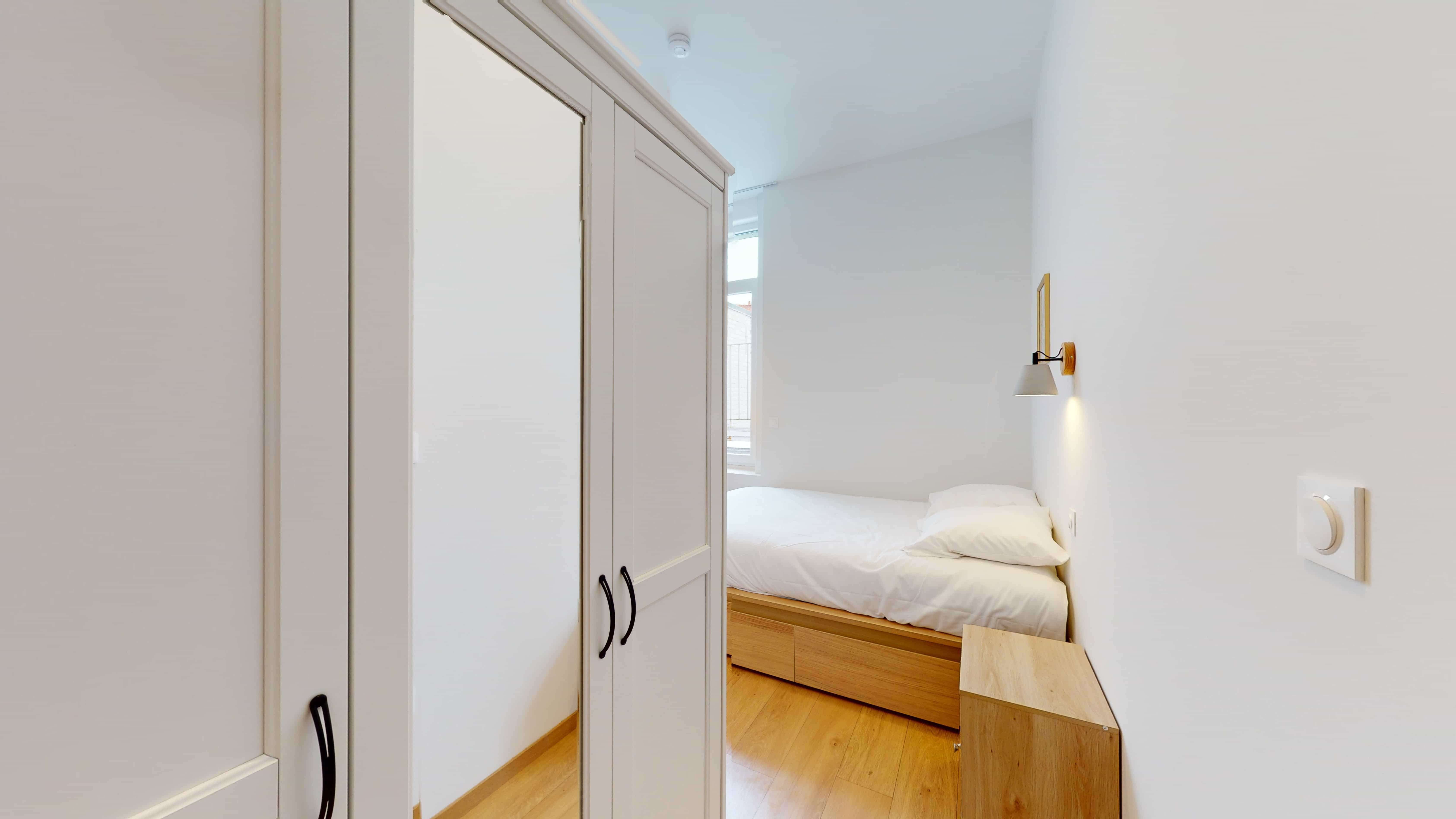 La chambre "Room for one person - 4", située au premier étage, est conçue pour offrir confort et fonctionnalité. Elle comprend un lit avec rangement double, un bureau avec sa chaise et une lampe, une penderie pour vos vêtements, ainsi qu'une salle de bain privative avec douche. La chambre est également équipée d'un micro-ondes, d'un réfrigérateur, et tout le nécessaire de literie haut de gamme pour assurer votre confort.