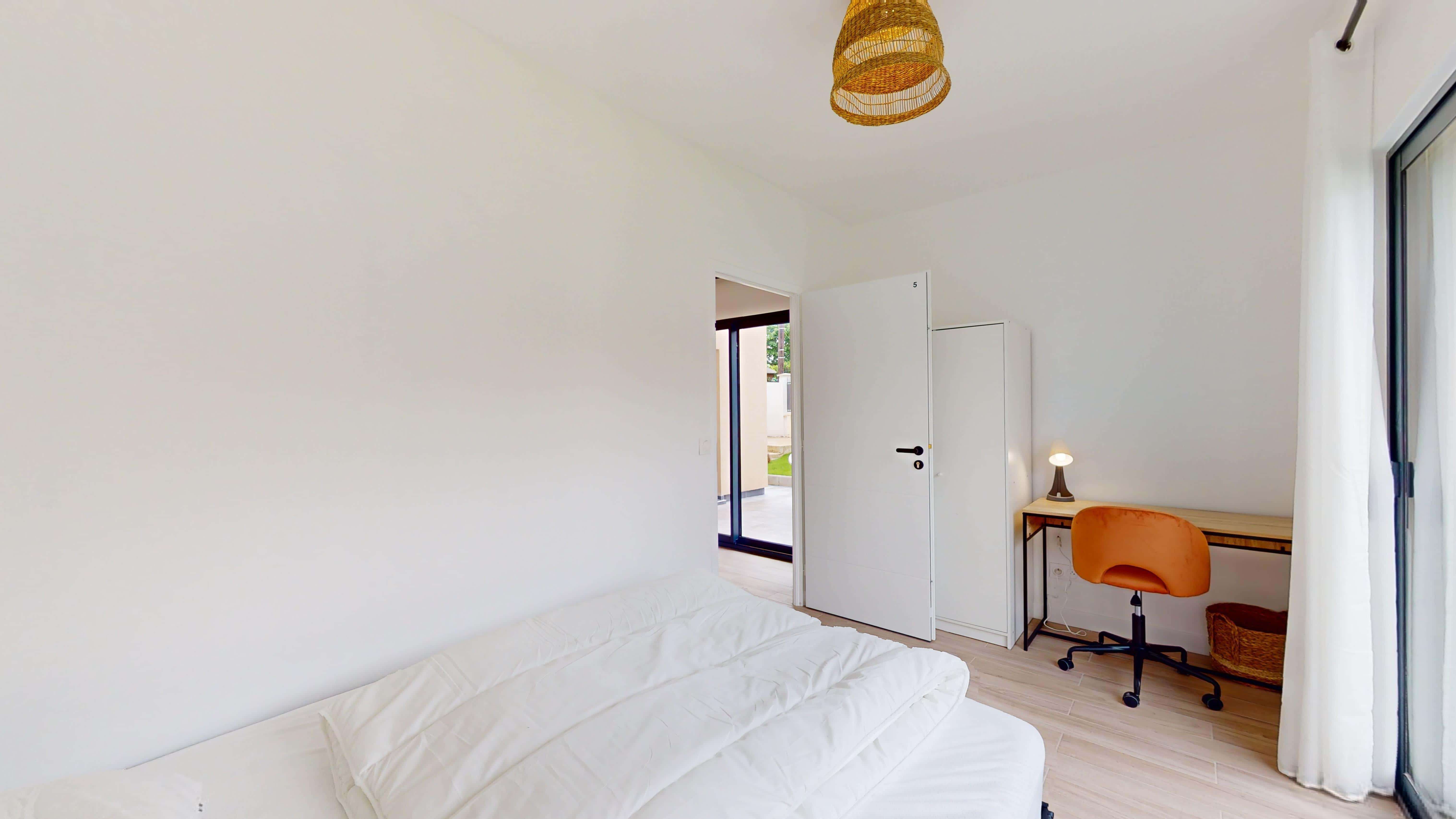 La chambre Room 5 est conçue spécialement pour une personne. Elle est meublée d'un confortable lit double, d'une armoire pour vos vêtements, d'une chaise et d'un bureau pour travailler ou étudier. La chambre partage une salle de bain moderne avec d'autres locataires, garantissant confort et intimité.
