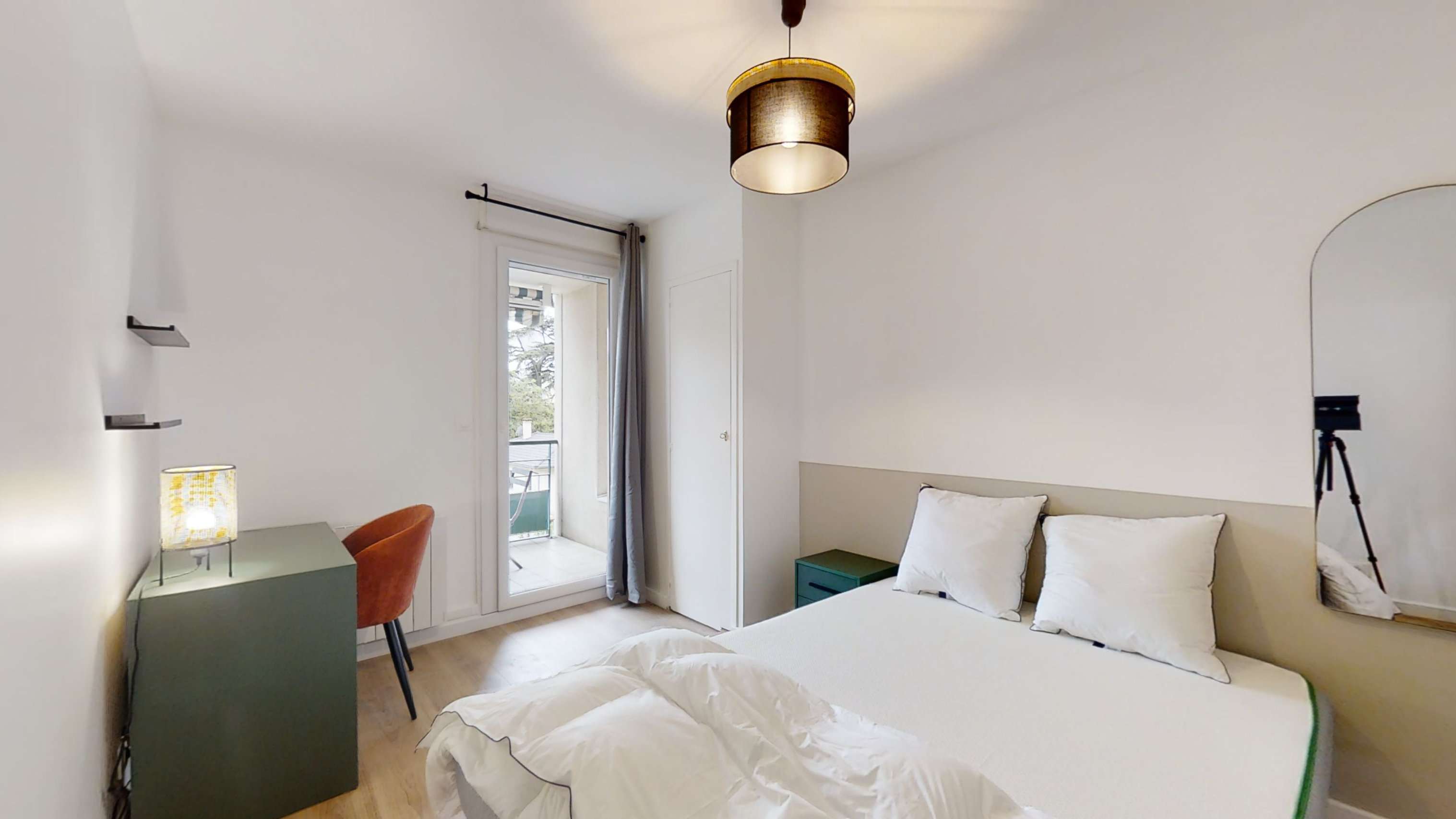 La chambre Room 5, d'une superficie de 11 m², est un espace privé pensé pour une personne. Avec un lit double confortable, une armoire spacieuse, un bureau pratique pour travailler, et une chaise, c'est l'endroit idéal pour se reposer et étudier. La chambre bénéficie également d'un balcon privé, ce qui ajoute à son charme. Elle partage une salle de bain moderne et propre avec les autres locataires.