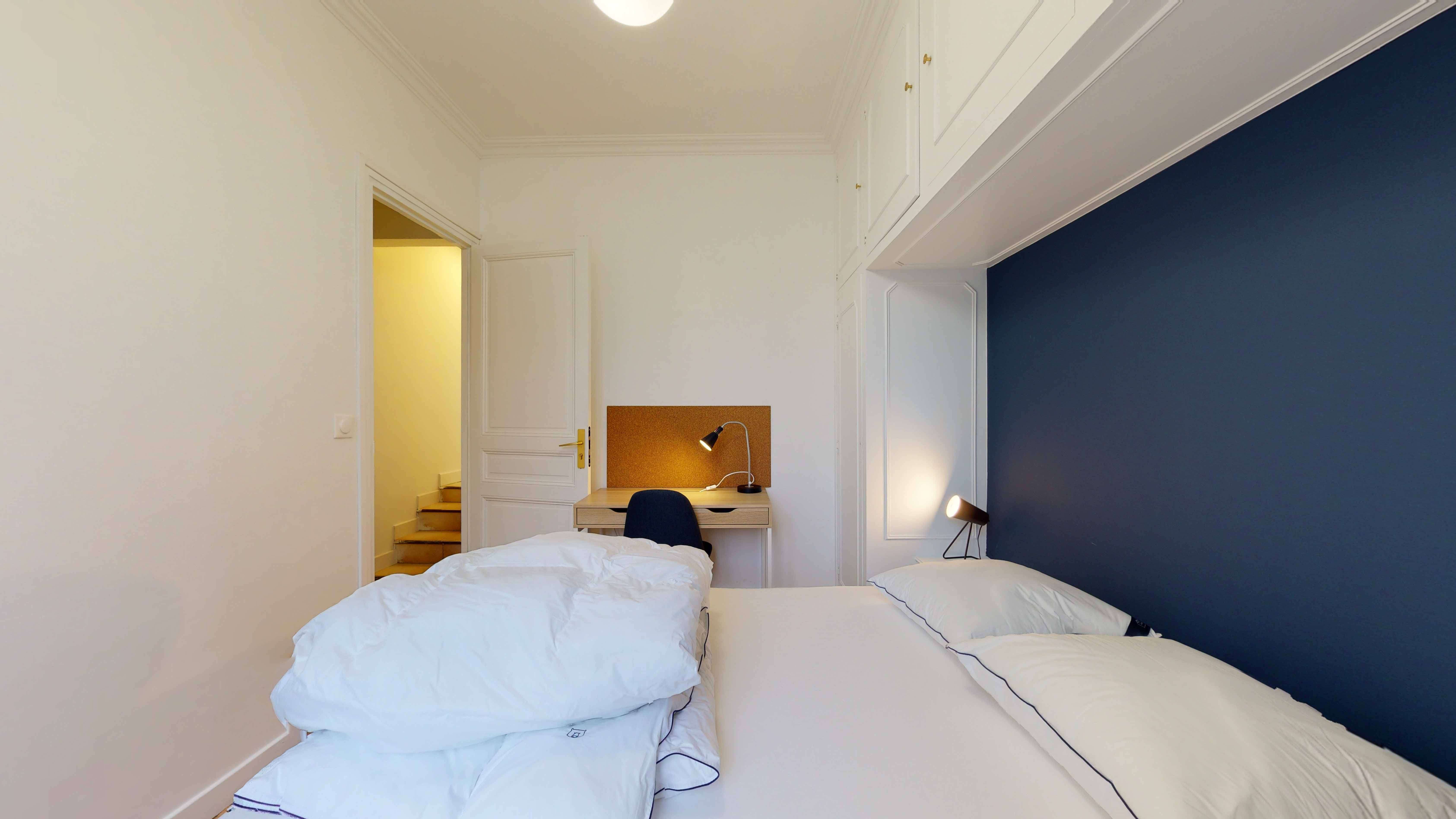 La chambre Room 1 est pensée pour une personne. Elle est meublée d'un lit double confortable, d'une armoire pour vos vêtements, d'un bureau et d'une chaise pour travailler ou étudier tranquillement. La chambre bénéficie également d'un éclairage doux grâce à une lampe de chevet et est chauffée par un radiateur. Une salle de bain avec douche est à partager avec quelques autres locataires.