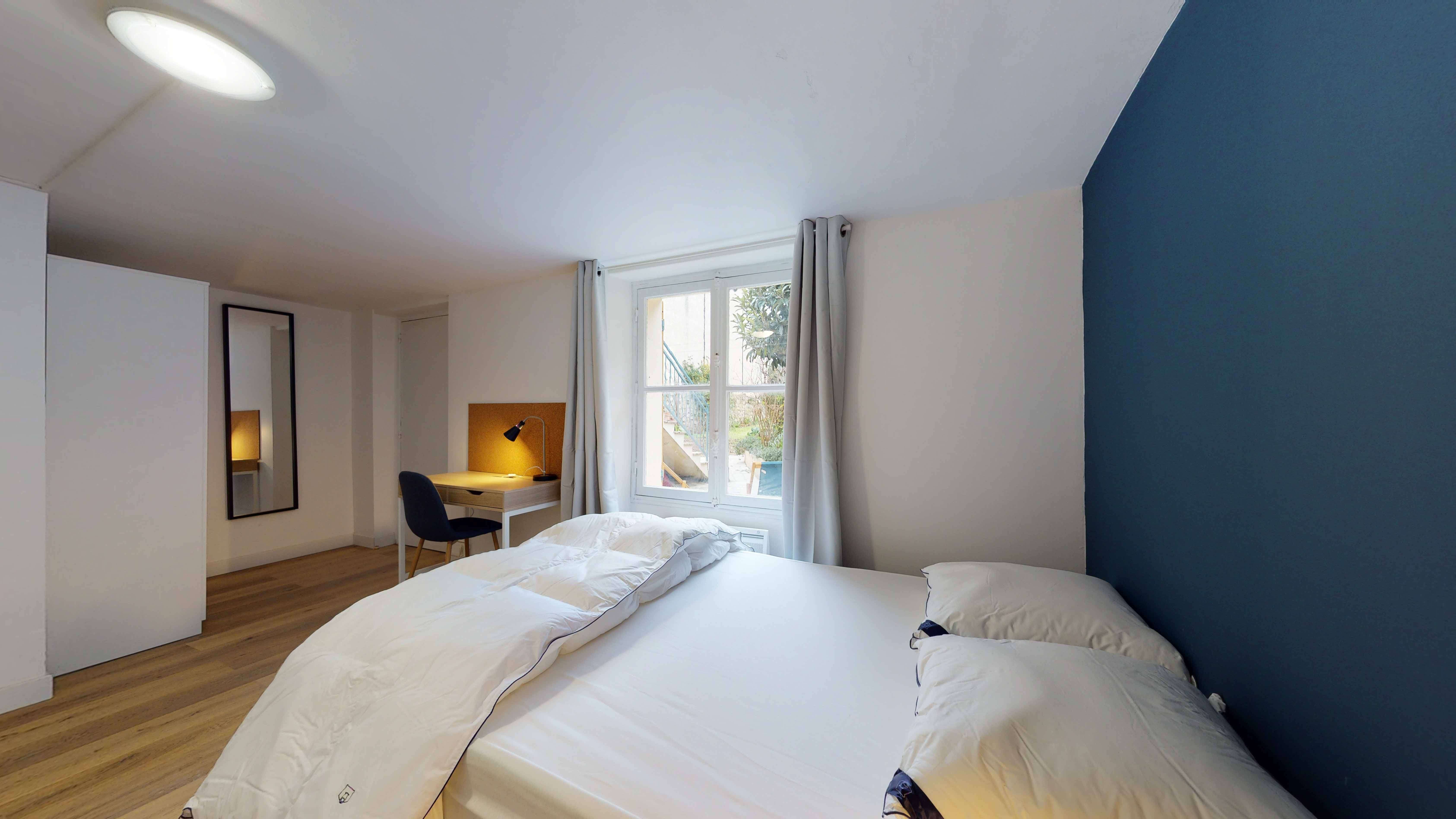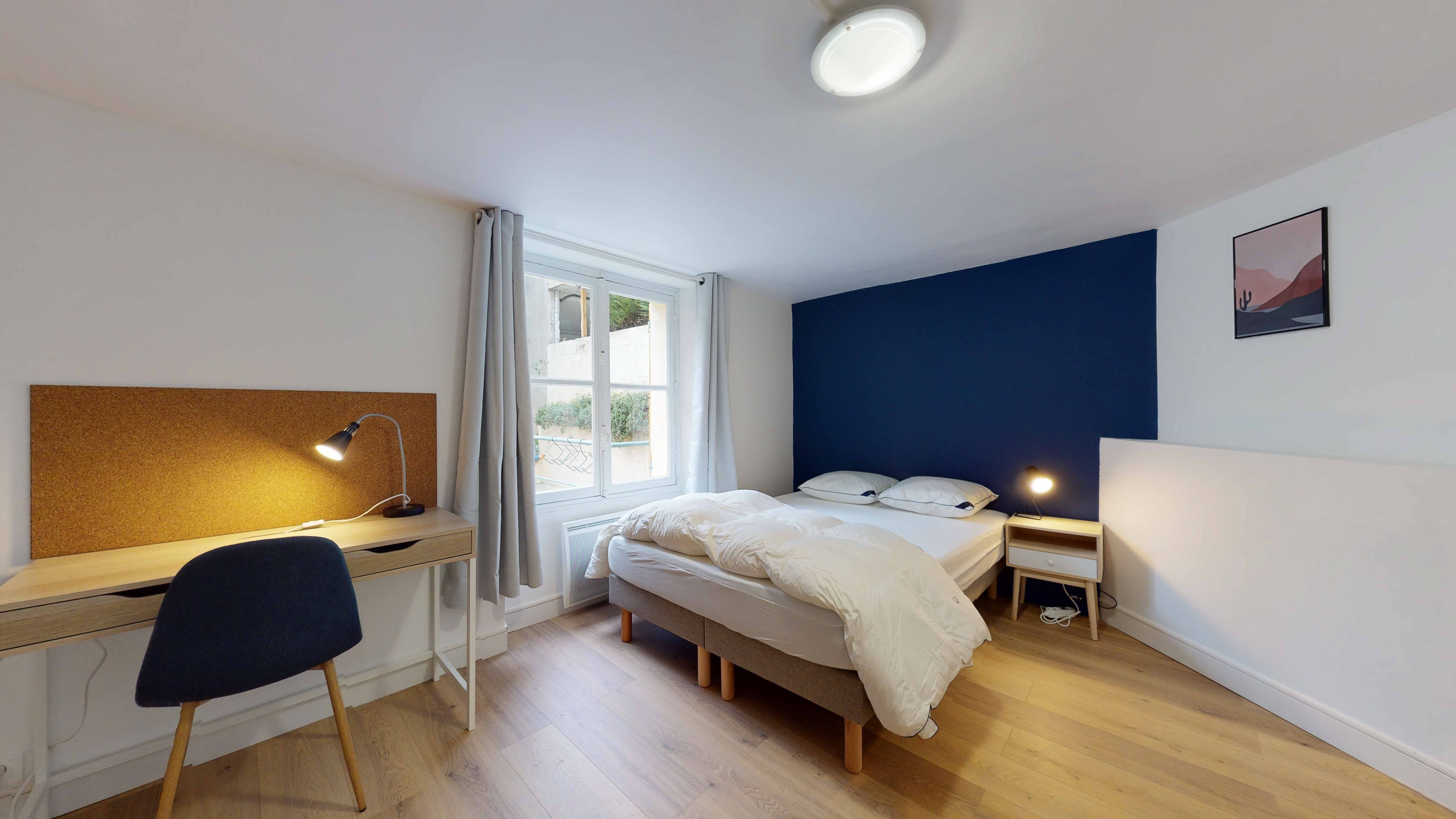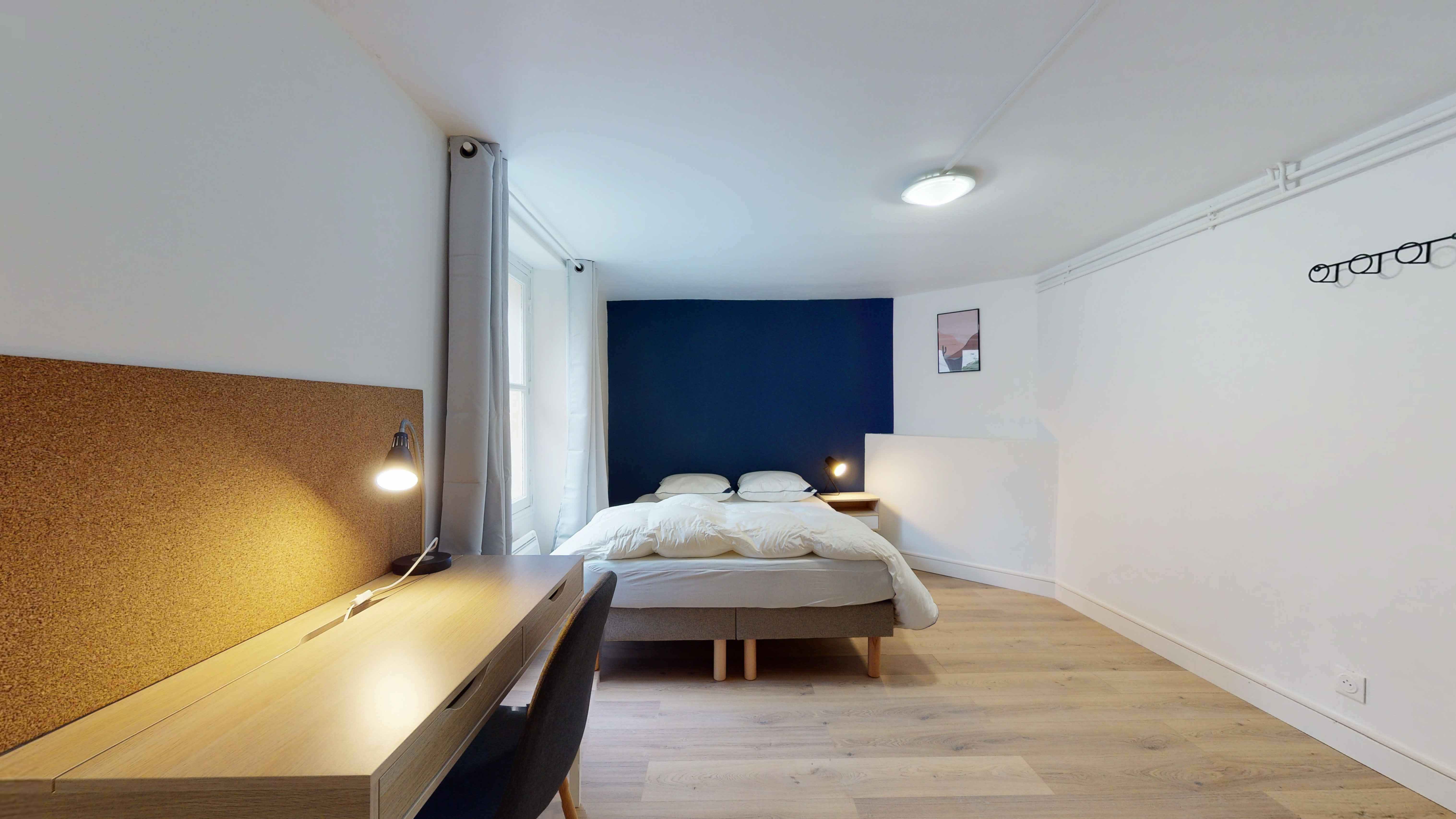 La chambre 6 est parfaite pour une personne. Elle a un lit double confortable, une armoire pour vos vêtements, un bureau pour travailler et une chaise. La chambre mesure 14 mètres carrés et partage une salle de bain moderne avec d'autres locataires. La pièce est chauffée par un radiateur et éclairée par une lampes de chevet.