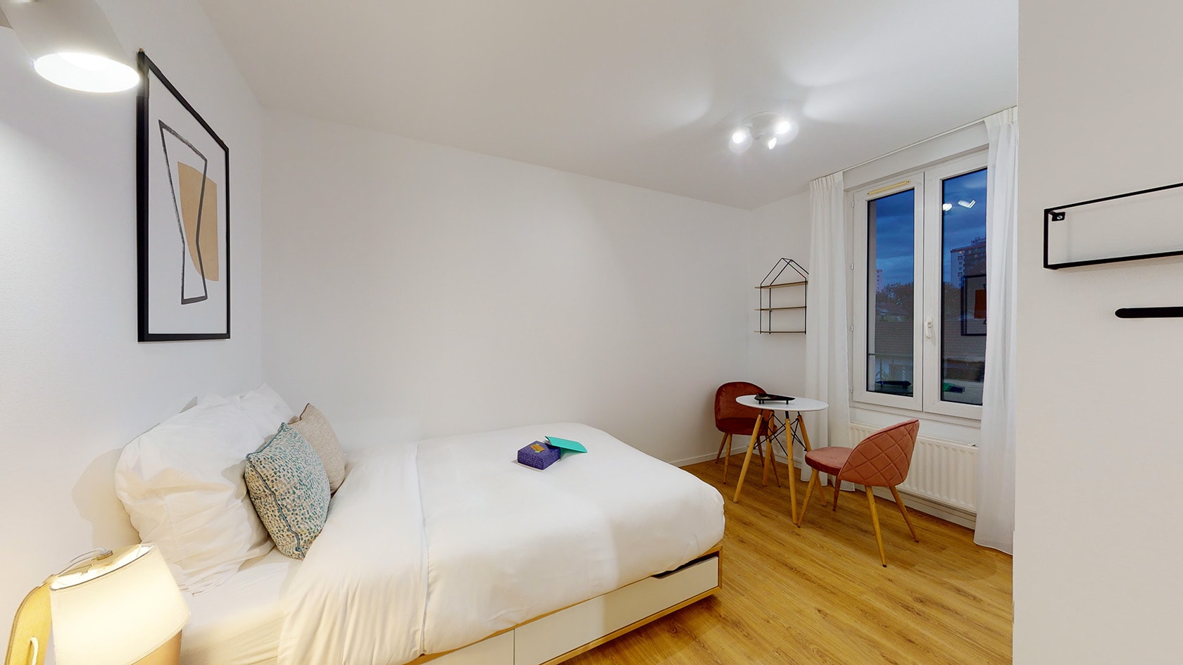La Chambre 6, située au premier étage, est un cocon parfait pour une personne. Elle est meublée d’un lit double confortable avec rangement intégré, d’une penderie pour vos vêtements, ainsi que d'une table et d'une chaise pour travailler ou étudier en toute tranquillité. La chambre partage une salle de bain bien équipée avec un autre locataire.