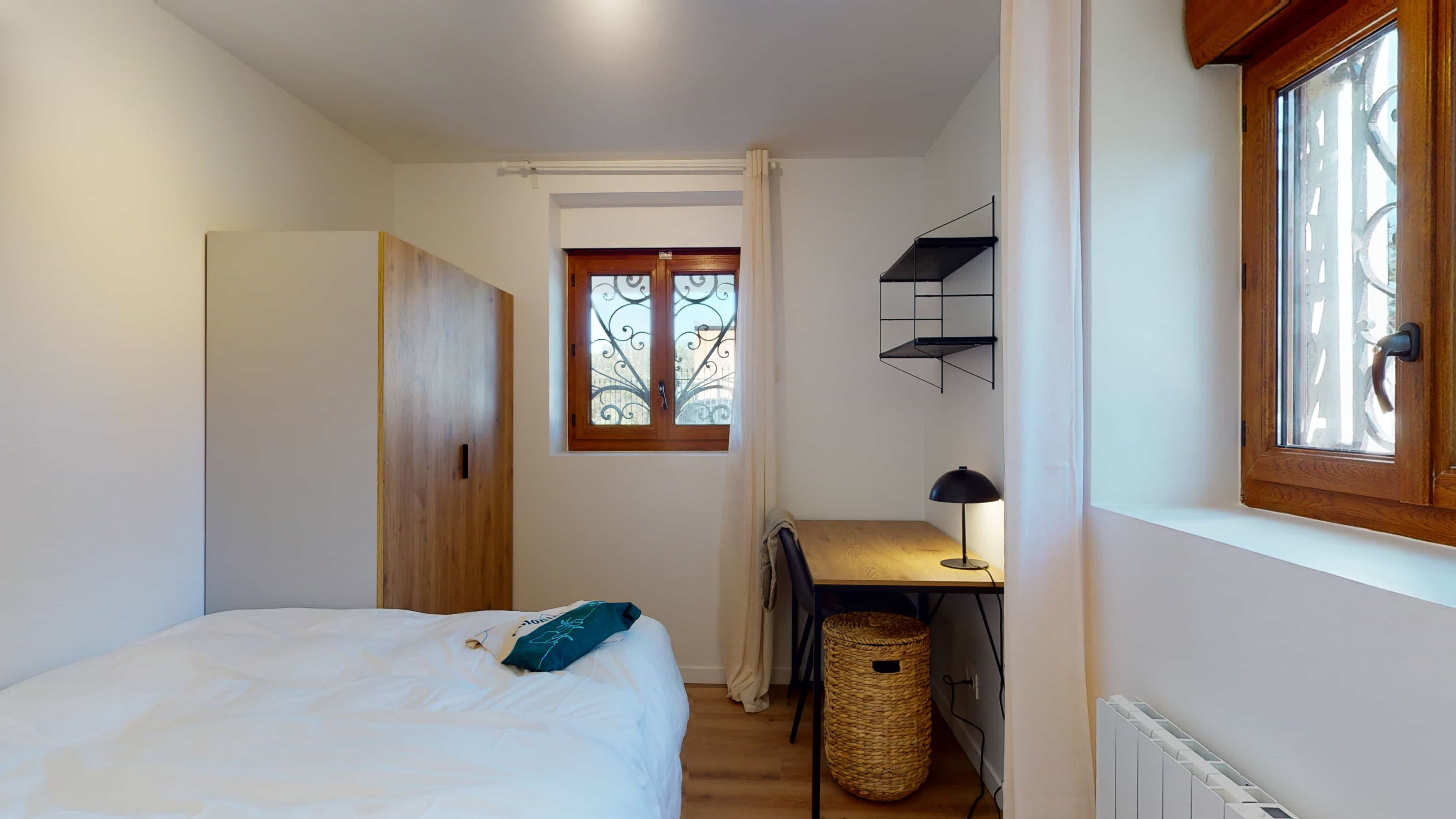 La chambre "Room for one person - 4" est un cocon douillet situé au rez-de-jardin. Elle est parfaite pour une personne avec son lit double confortable, une armoire pour vos affaires, un bureau et une chaise pour travailler ou étudier. La salle de bain est partagée avec un autre locataire et comprend une douche moderne, un lavabo et des toilettes. La chambre est également équipée d'un radiateur pour rester au chaud en hiver.
