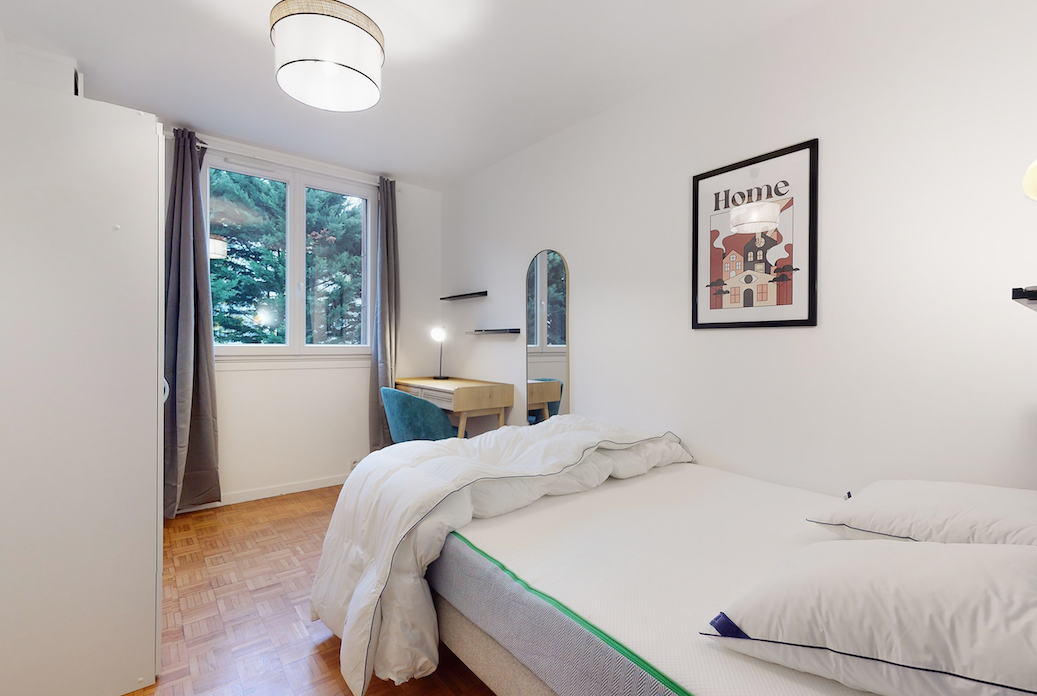 La chambre que nous proposons est parfaite pour une personne seule. Elle dispose d'un confortable lit double, d'une armoire pour ranger toutes vos affaires, d'une chaise et d'un bureau pour travailler ou étudier en paix. De plus, elle partage une salle de bain bien équipée avec douche et toilettes.