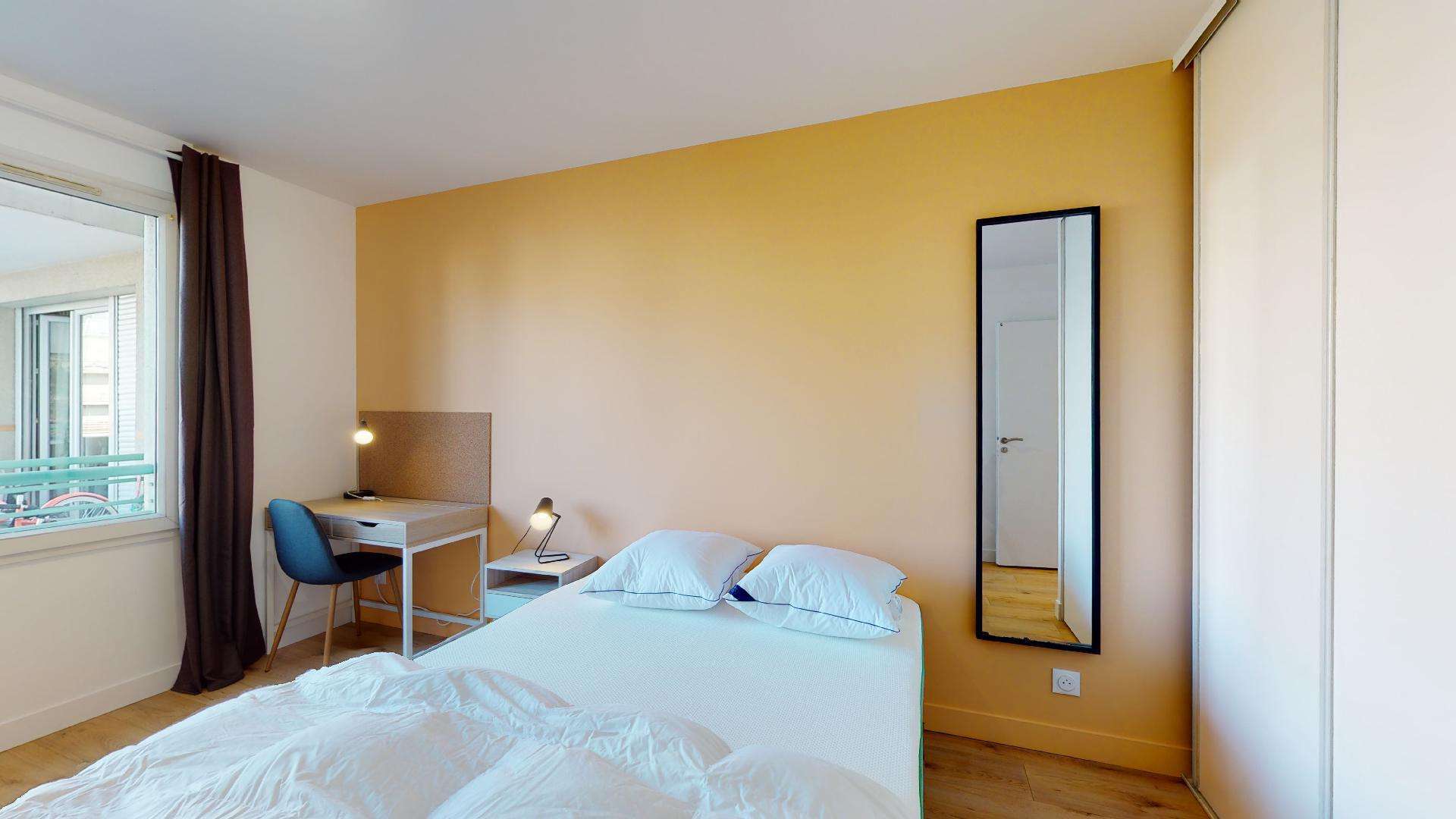 La chambre 4 est conçue pour accueillir confortablement une personne. Elle est équipée d'un lit double avec une literie de qualité, d'une armoire pour vos vêtements, d'un bureau et d'une chaise pour travailler ou étudier, ainsi que d'une table de nuit. La chambre partage une salle de bain complète avec douche, lavabo et toilettes avec d'autres résidents.