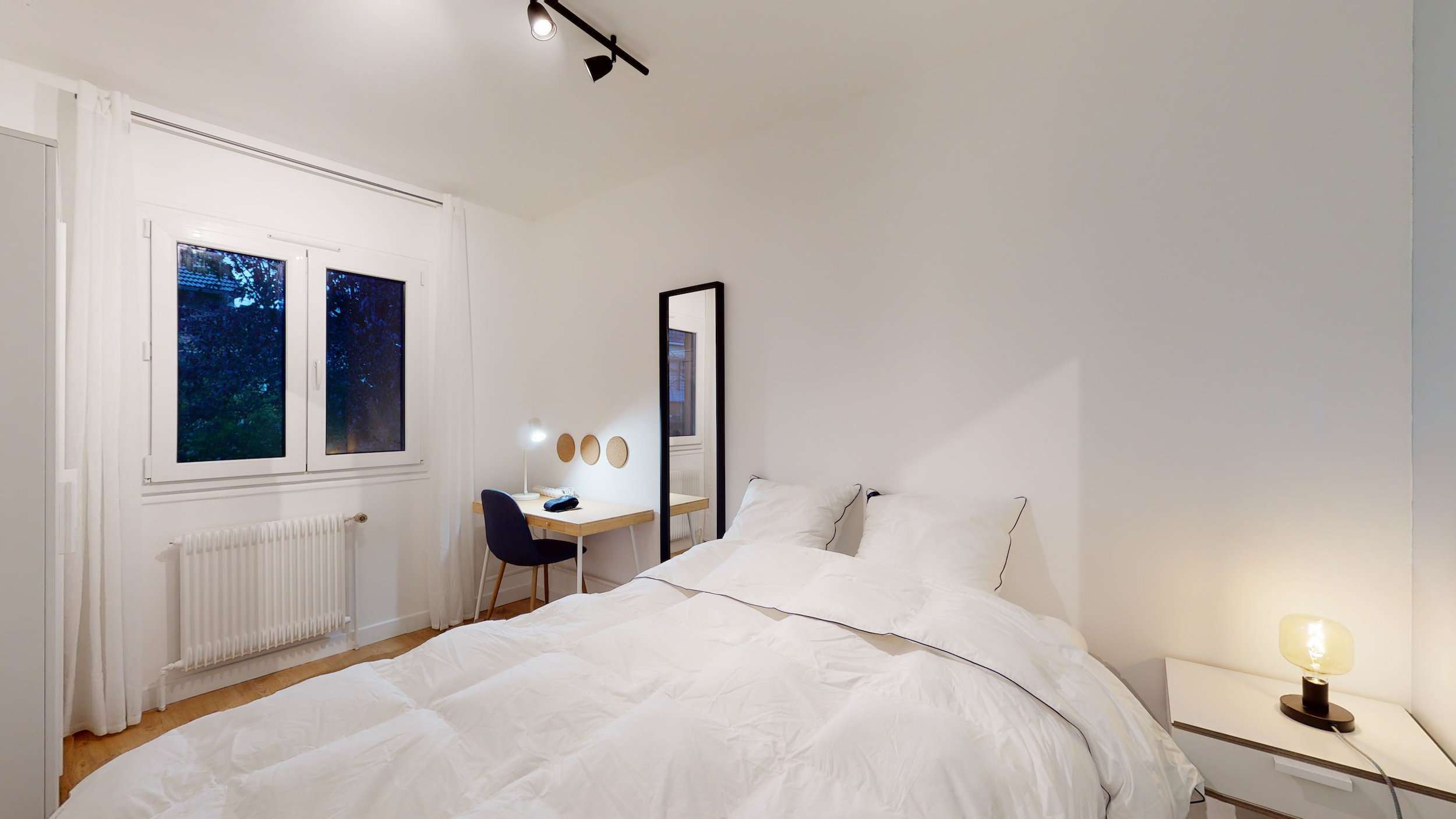 La chambre 3, conçue pour une seule personne, est douillette et fonctionnelle. Avec son lit double confortable, son armoire pour vos affaires, un bureau et une chaise pour travailler ou étudier, vous vous y sentirez à l'aise. La salle de bain est partagée avec d'autres locataires et comprend une douche, un lavabo et des toilettes.