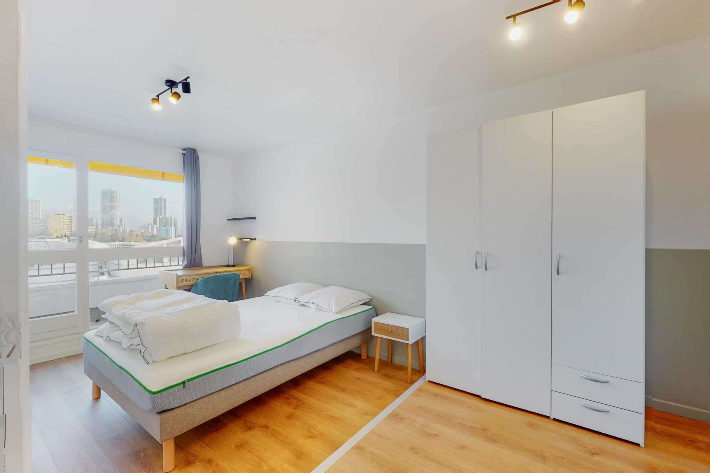 Room 4 est votre espace personnel. Cette chambre de 13 m² est meublée d'un confortable lit double, d'une armoire pour vos affaires, d'un bureau et d'une chaise pour travailler ou étudier. Vous aurez aussi accès à un balcon privé et partagerez une salle de bain moderne avec d'autres locataires.