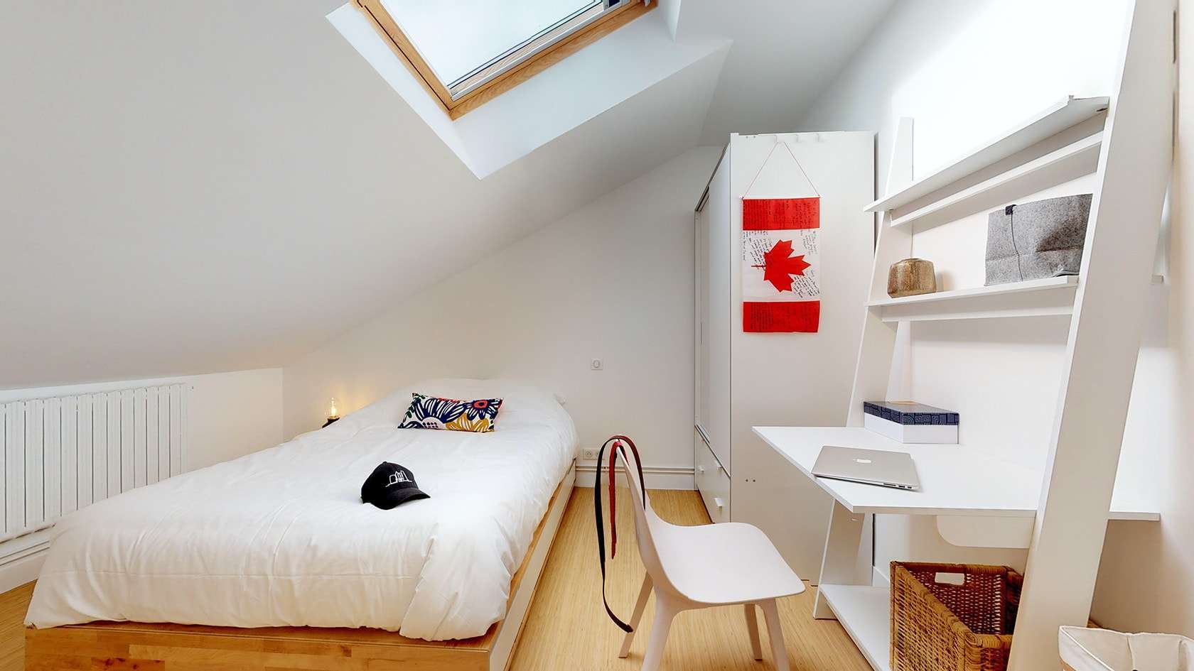 Votre future chambre, la numéro 8, est un espace personnel et confortable situé au second étage. Elle est parfaite pour une personne et comprend tout ce dont vous avez besoin : un lit avec des rangements intégrés, une penderie pour vos vêtements, un fauteuil pour vous relaxer et un bureau d'appoint pour travailler ou étudier. La chambre partage une salle de bain avec douche avec deux autres locataires.