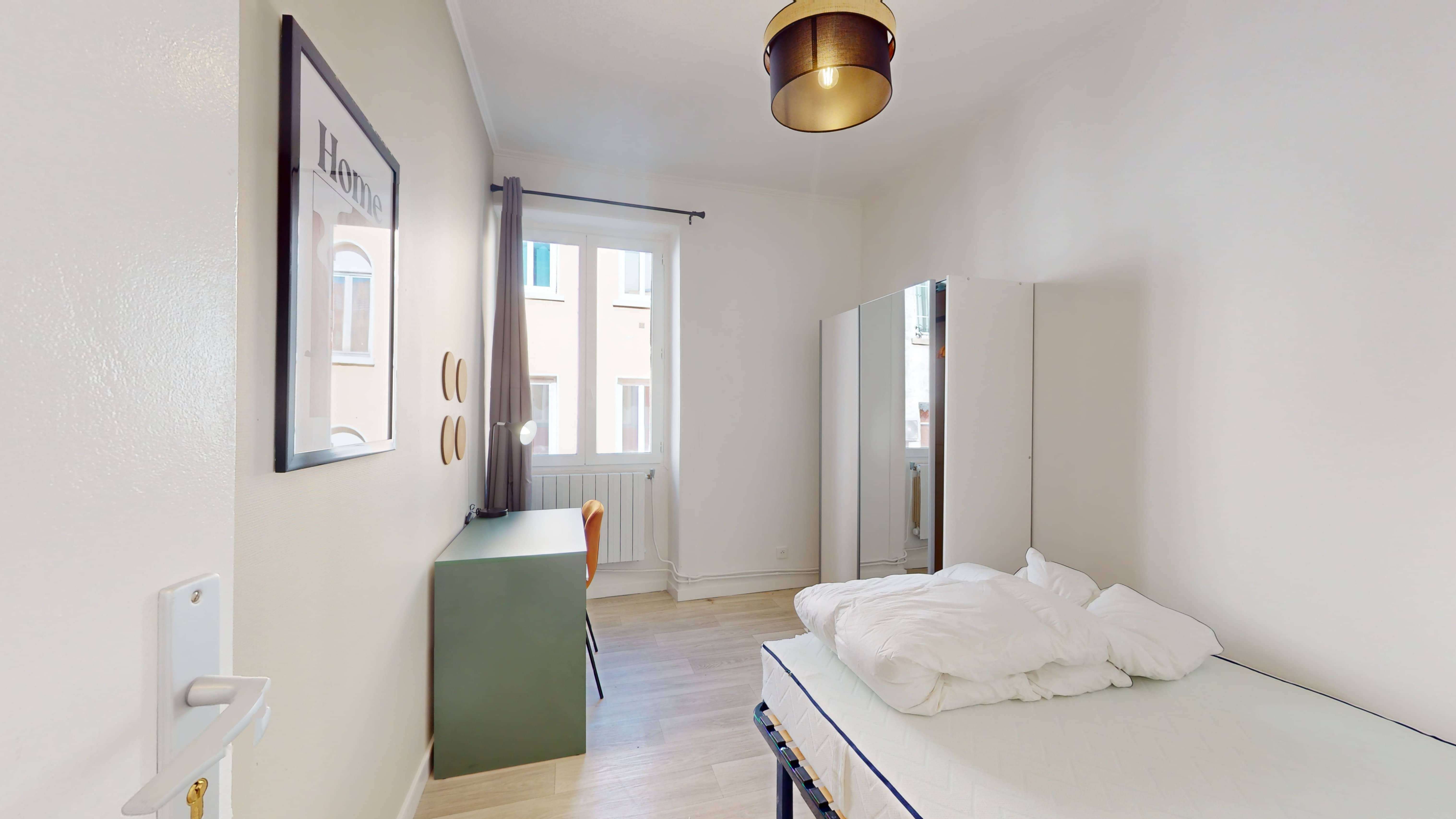 La chambre 3 est conçue juste pour vous, avec un confortable lit double, une armoire spacieuse et un espace de travail composé d'un bureau et d'une chaise. Vous partagerez une salle de bain moderne avec quelques autres colocataires, mais pas de souci, il y a assez d'espace pour que tout le monde se prépare sans stress.
